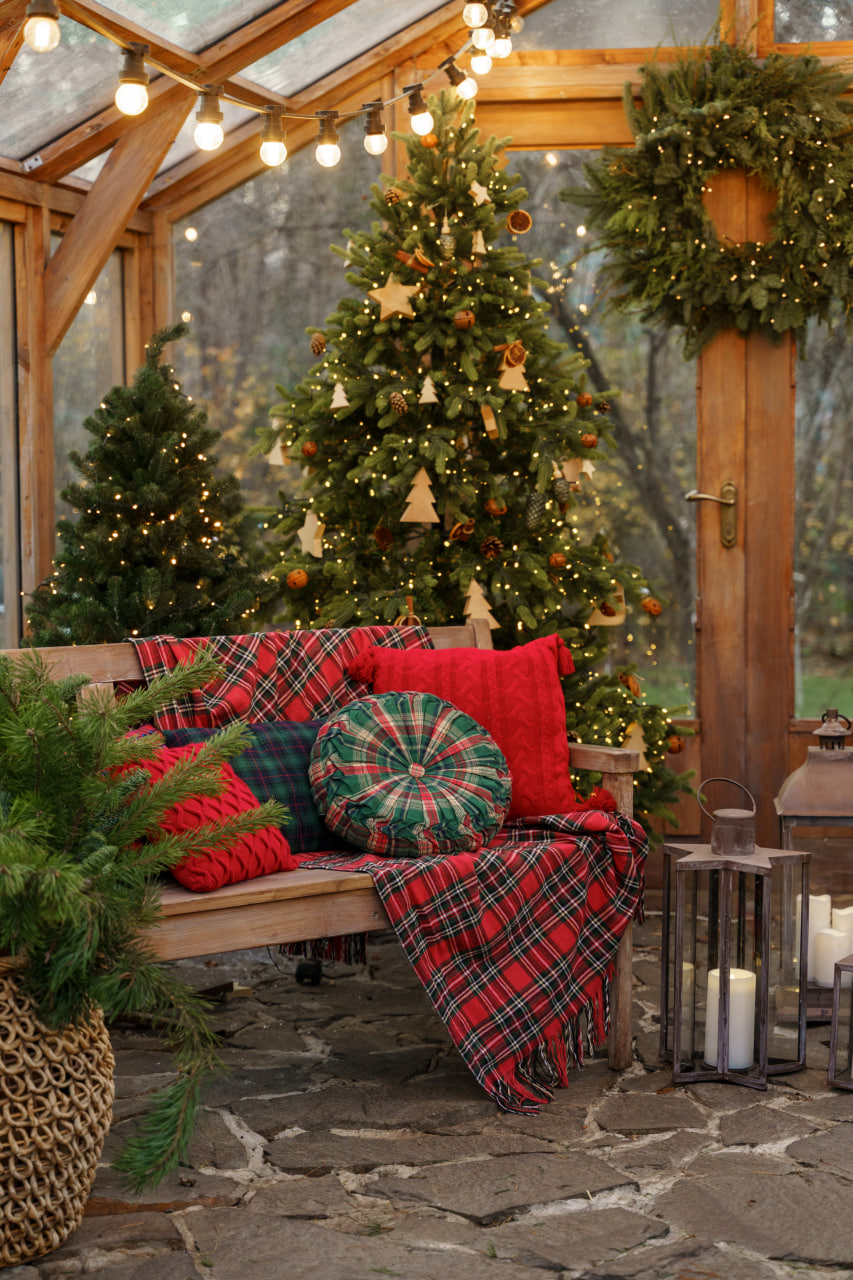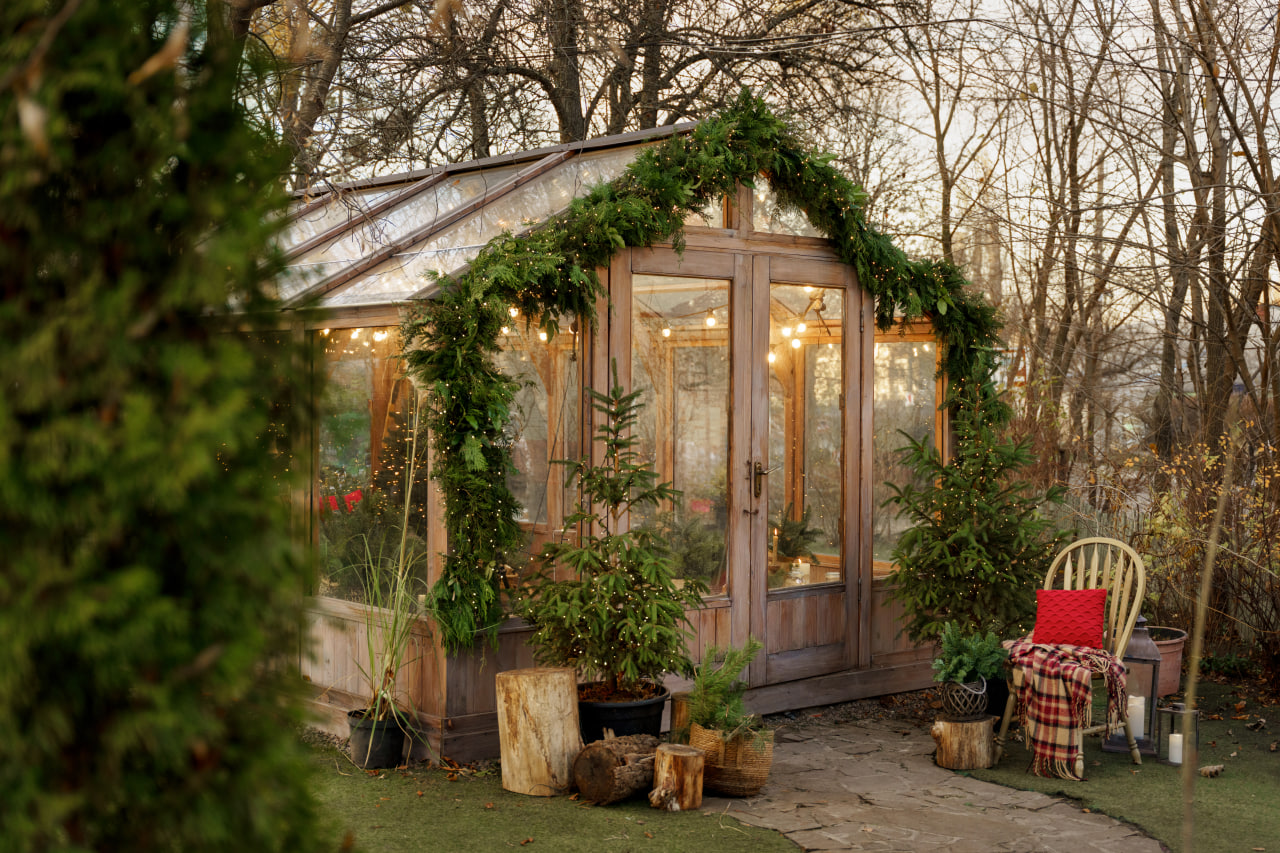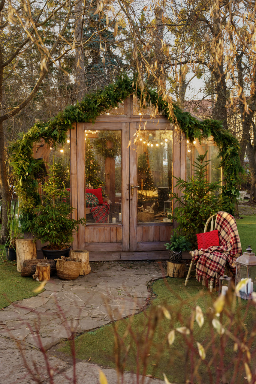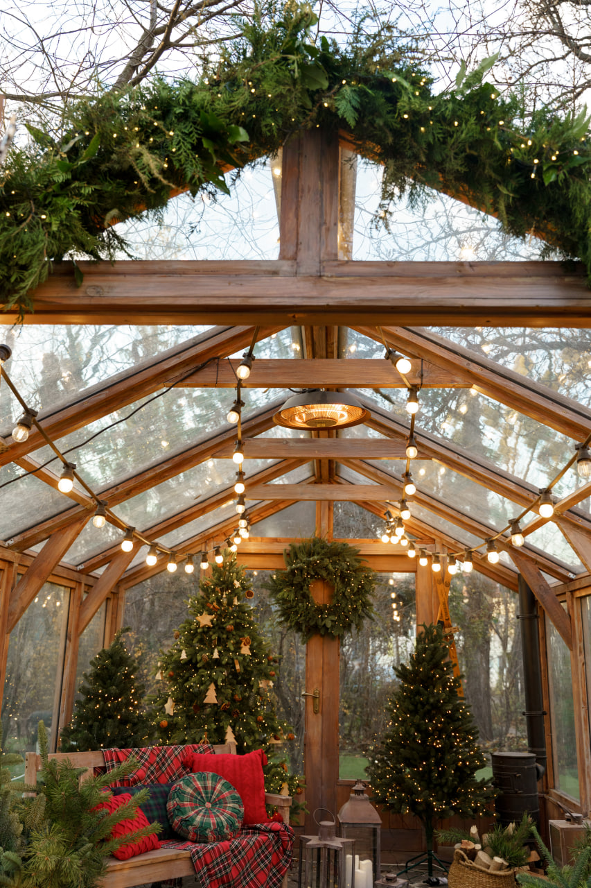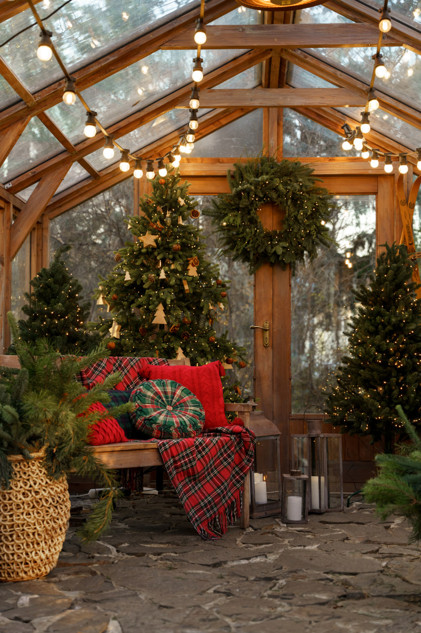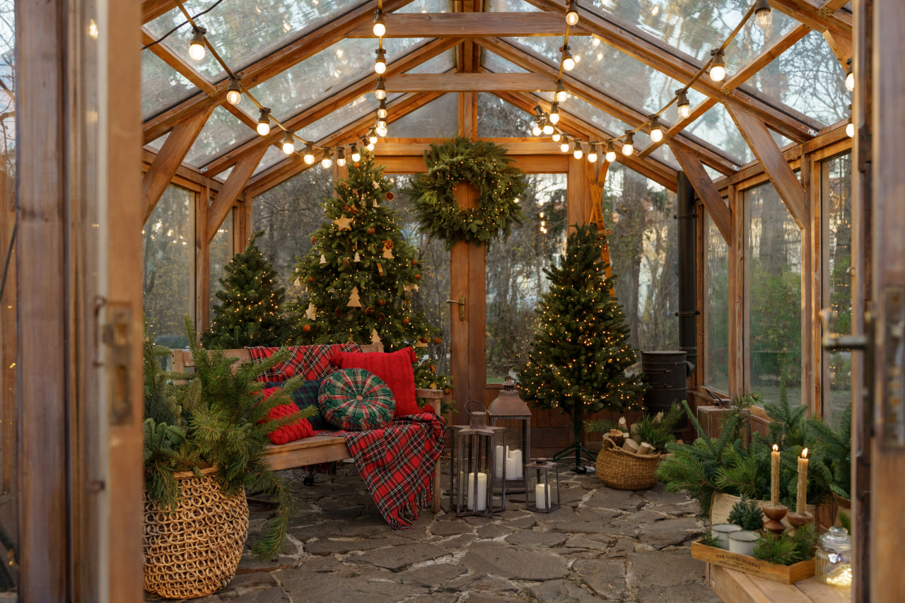 Теплиця (4,5х3м) та зона перед нею, що перетворилися на казковий простір з хвойними гірляндами, прикрашеними ялинками, деревʼяною лавкою, теплими ковдрами та подушками – в традиційних кольорах Різдва, різноманітним святковим декором та вогниками.