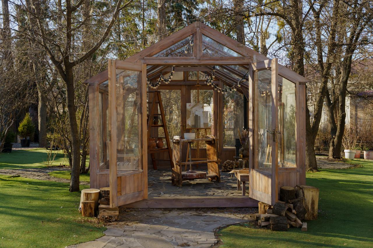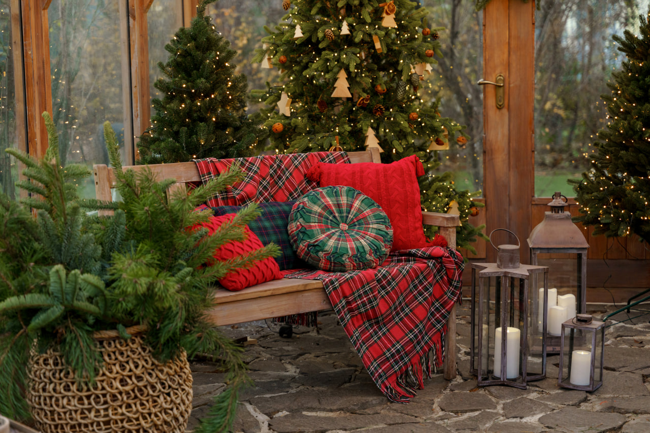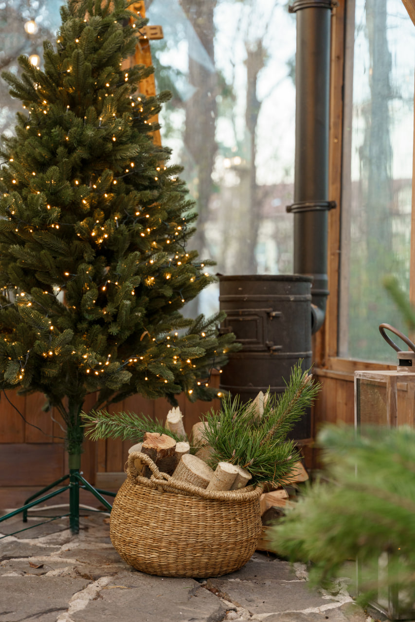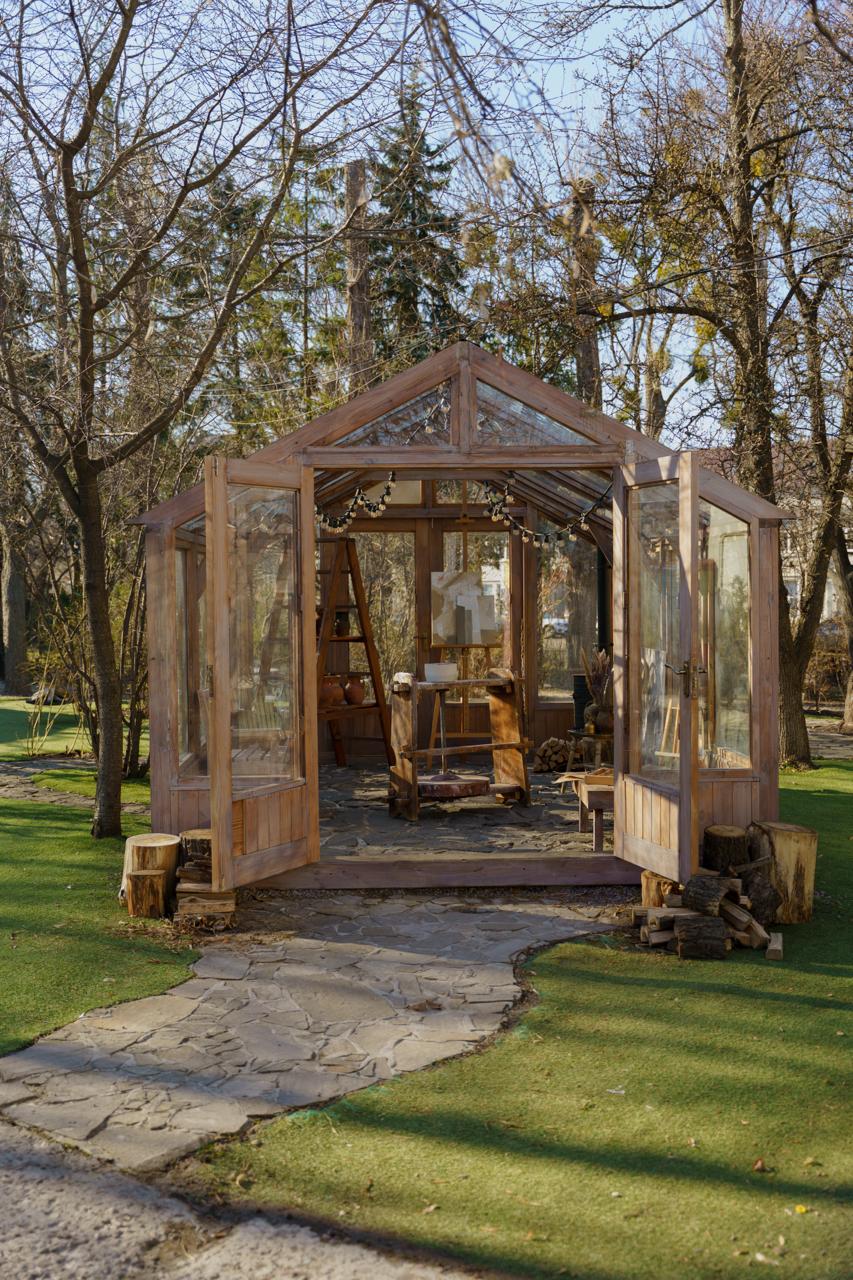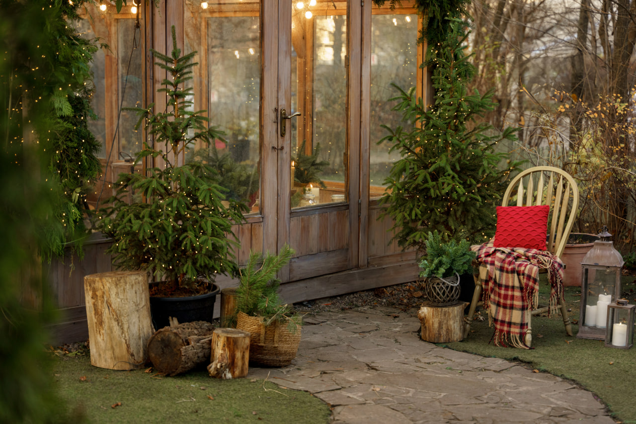 Теплиця (4,5х3м) та зона перед нею, що перетворилися на казковий простір з хвойними гірляндами, прикрашеними ялинками, деревʼяною лавкою, теплими ковдрами та подушками – в традиційних кольорах Різдва, різноманітним святковим декором та вогниками.