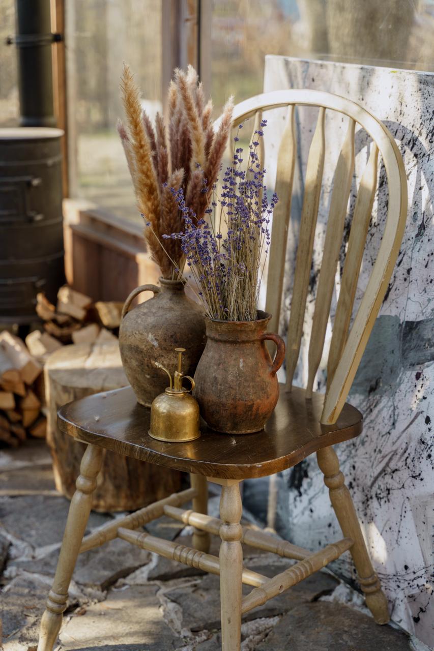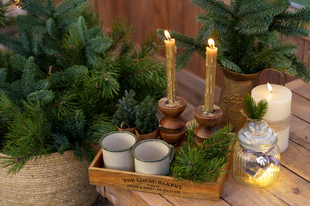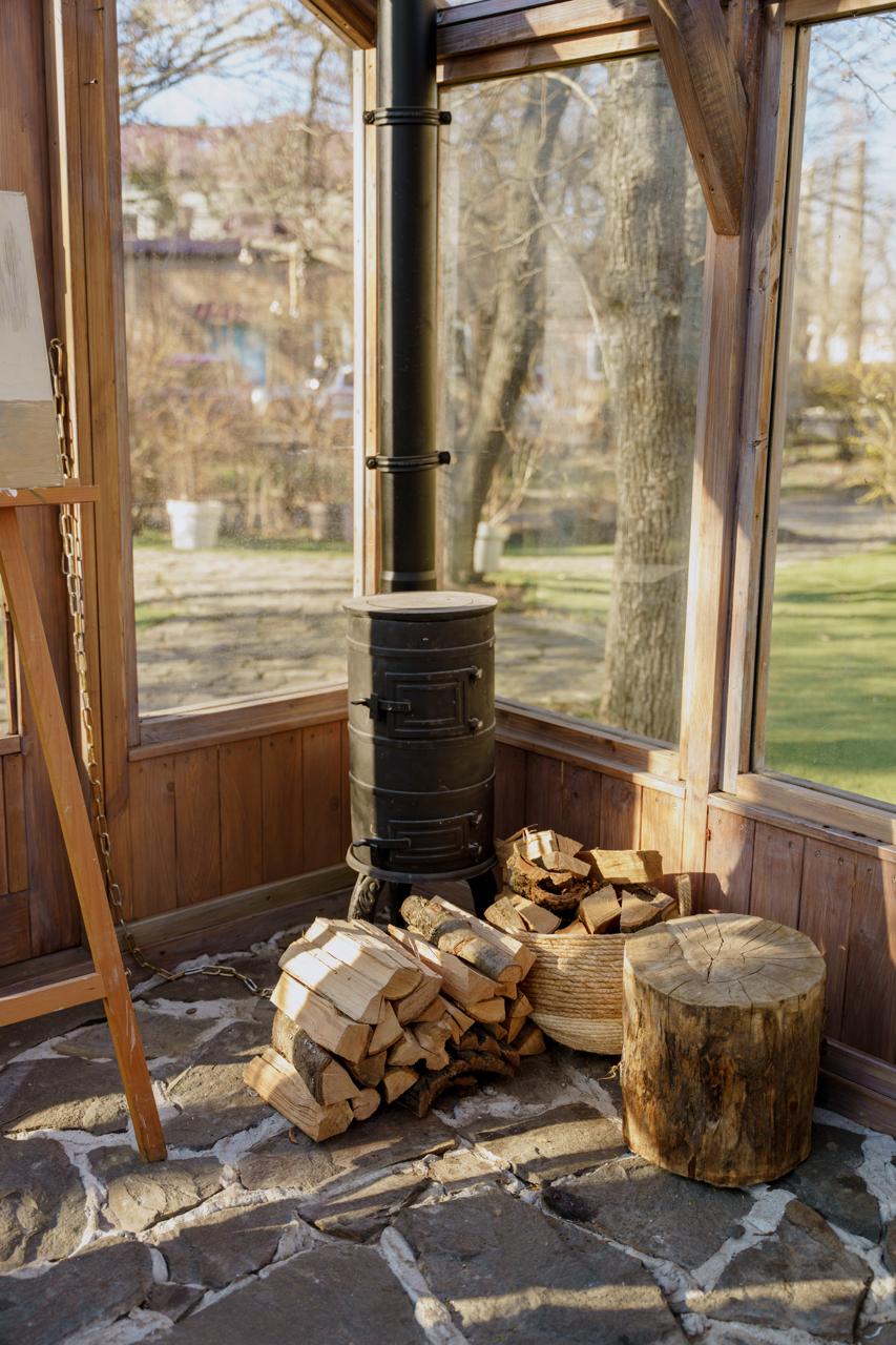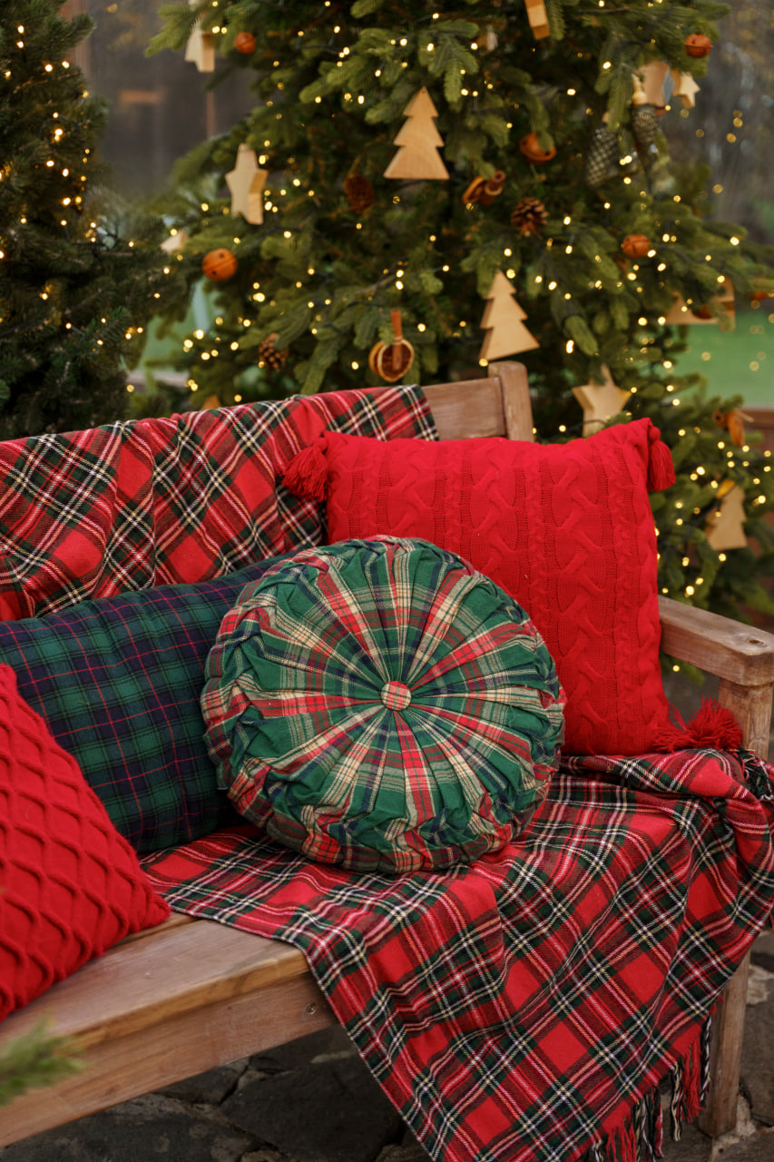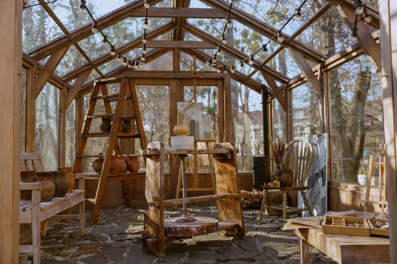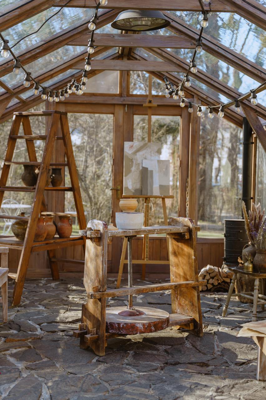 Теплиця (4,5х3м) та зона перед нею, що перетворилися на казковий простір з хвойними гірляндами, прикрашеними ялинками, деревʼяною лавкою, теплими ковдрами та подушками – в традиційних кольорах Різдва, різноманітним святковим декором та вогниками.