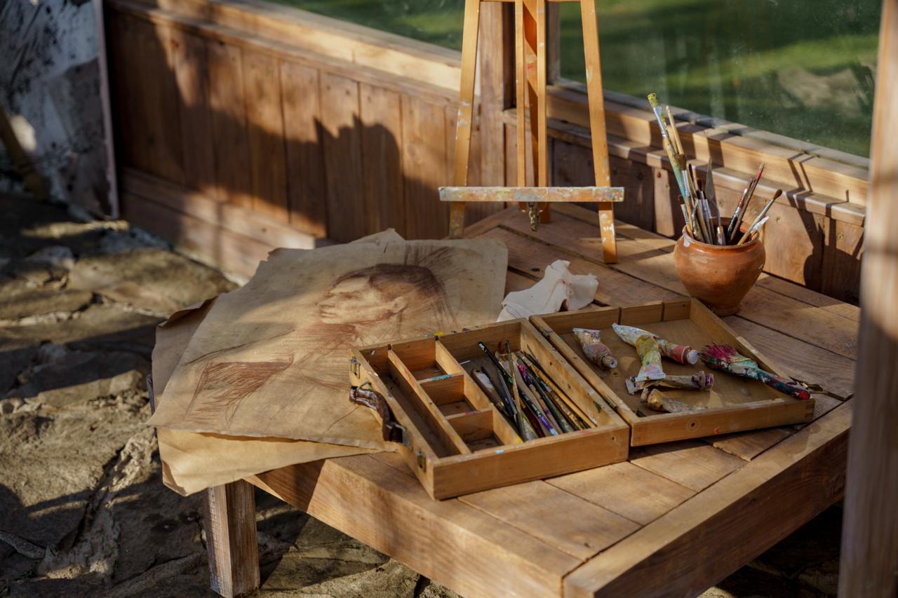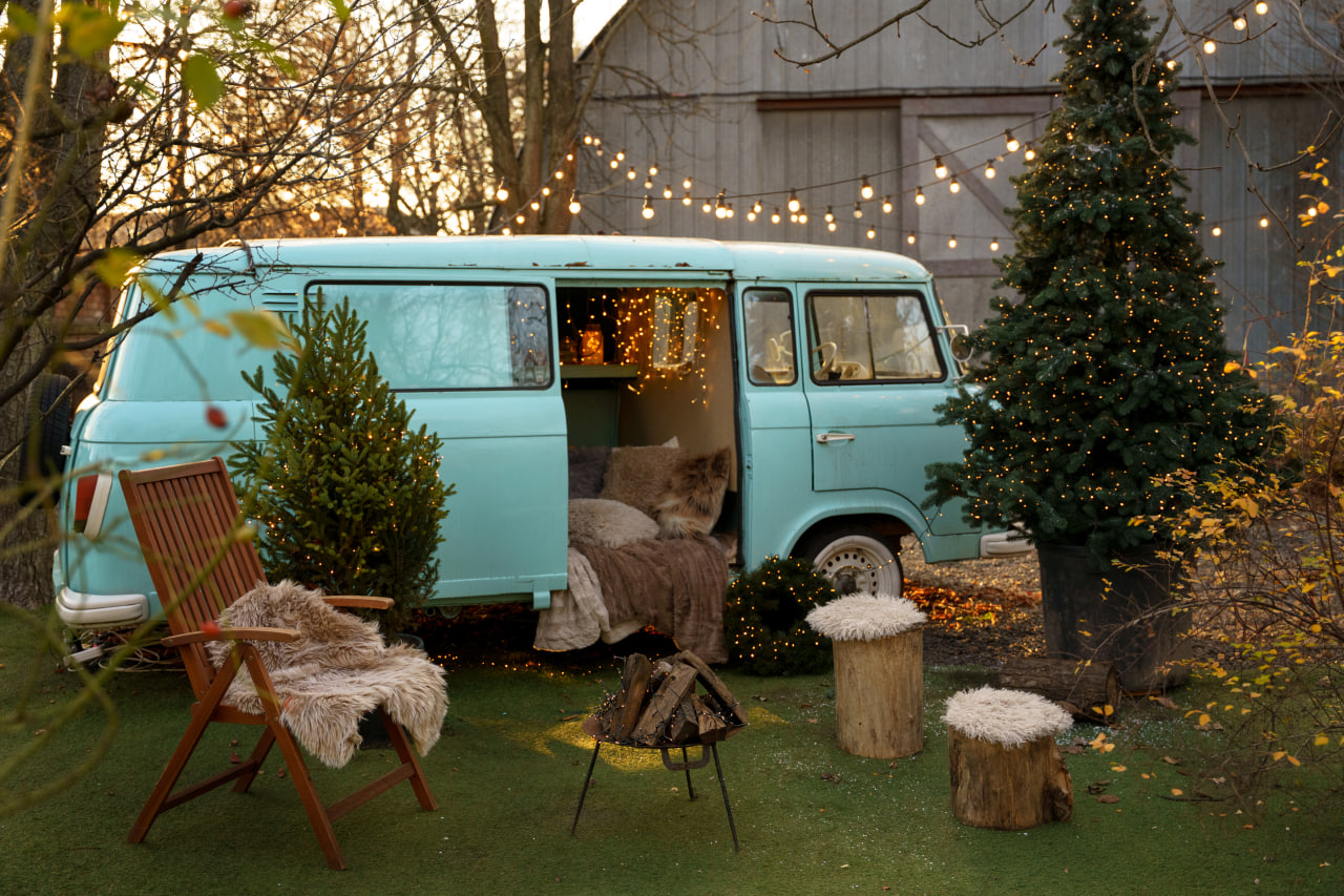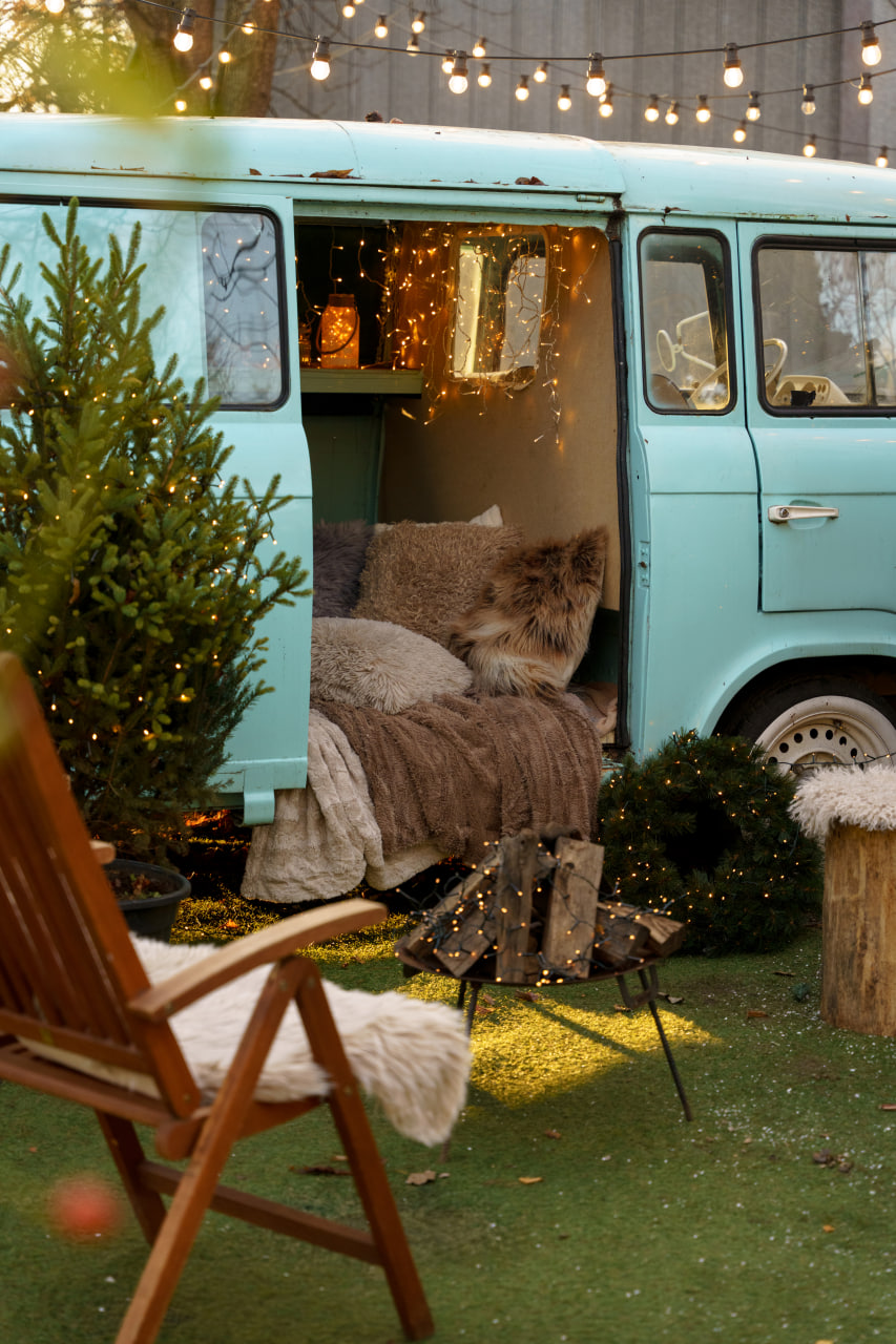 Друга локація – вінтажний блакитний бус, прикрашений мерехтливими гірляндами та затишно оформлений всередині.