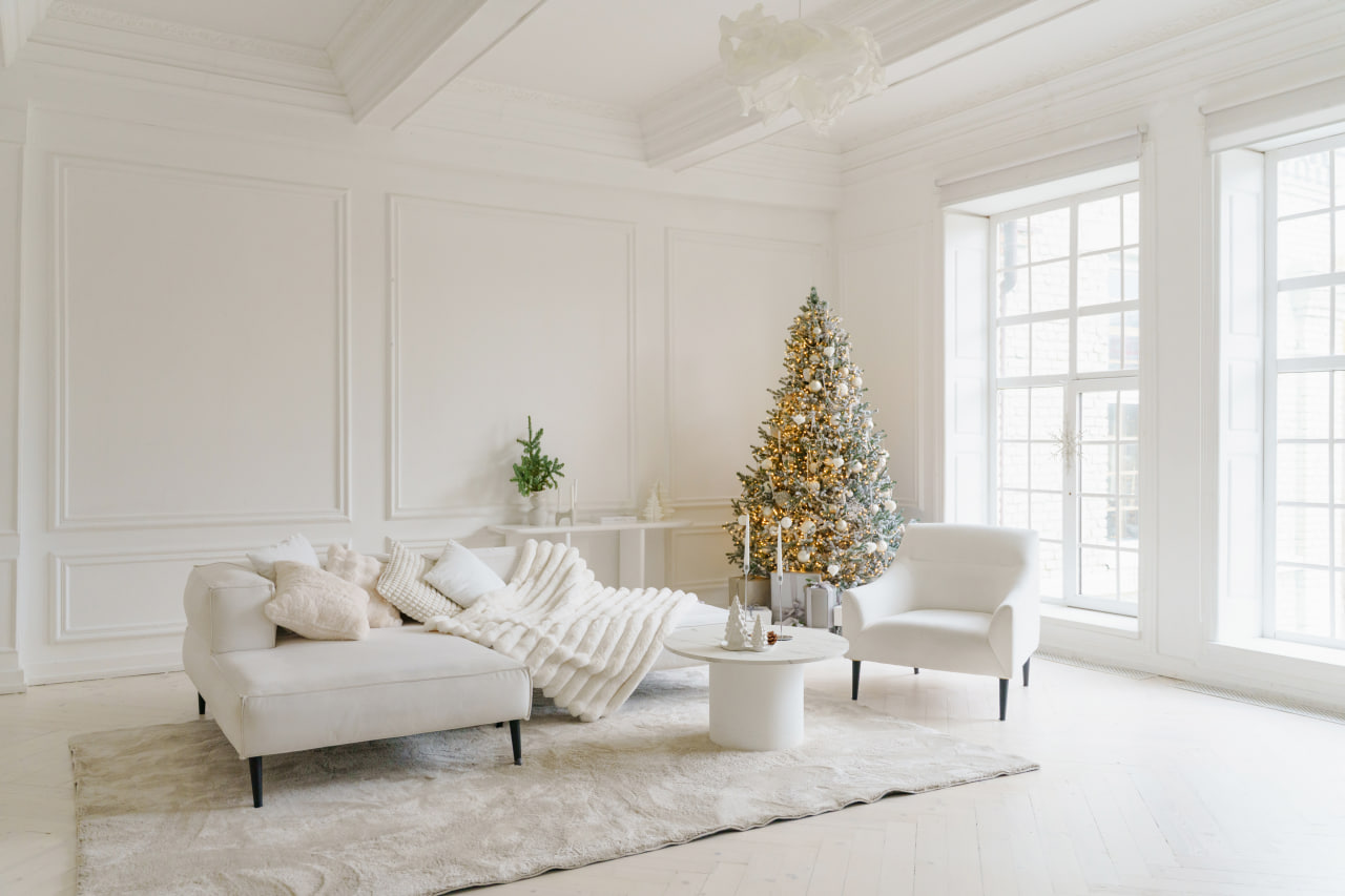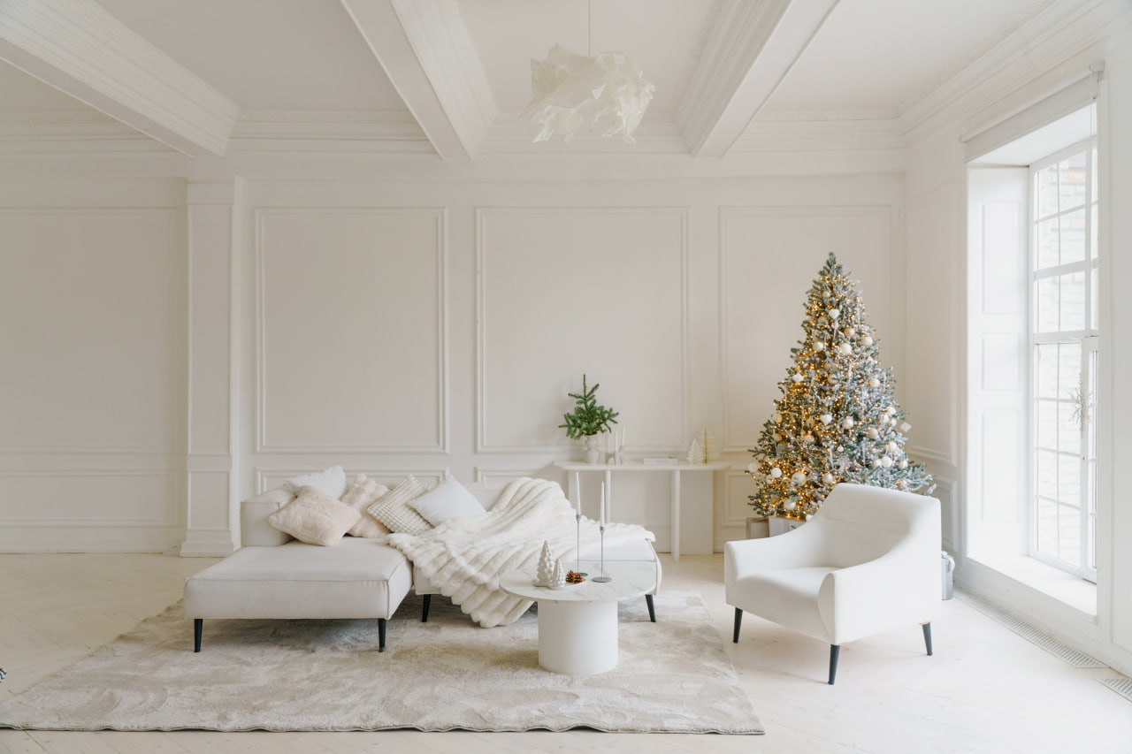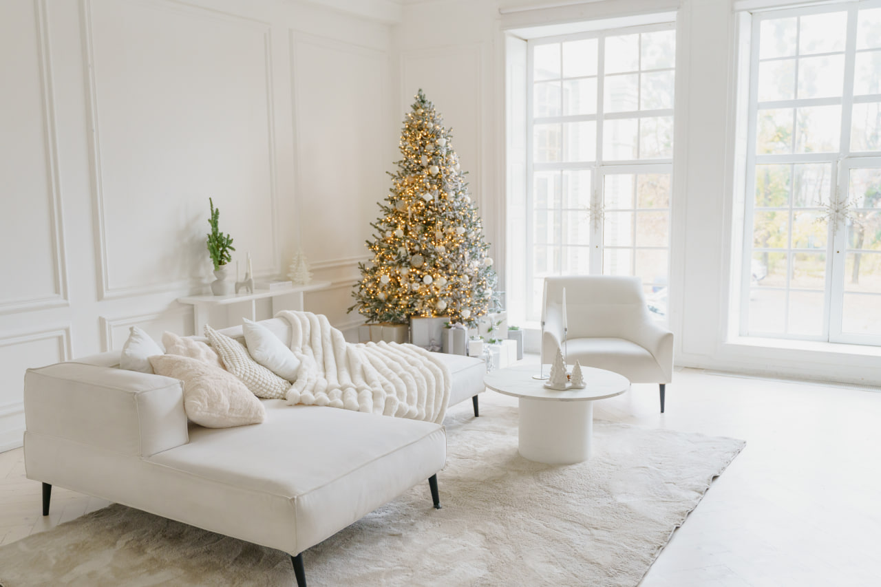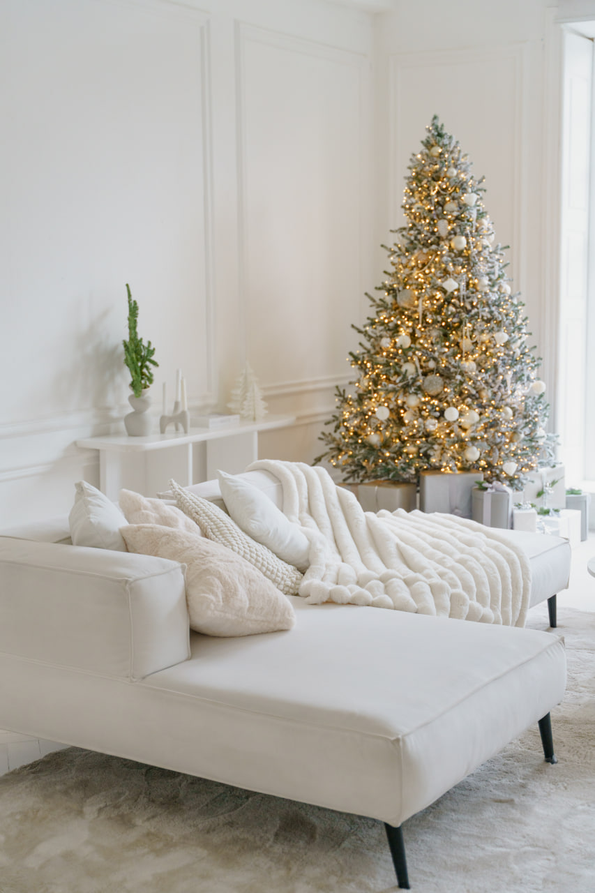 Друга локація – елегантна вітальня з білим диваном та кріслом, ошатною ялинкою, різдвяними подарунками та стильним декором.