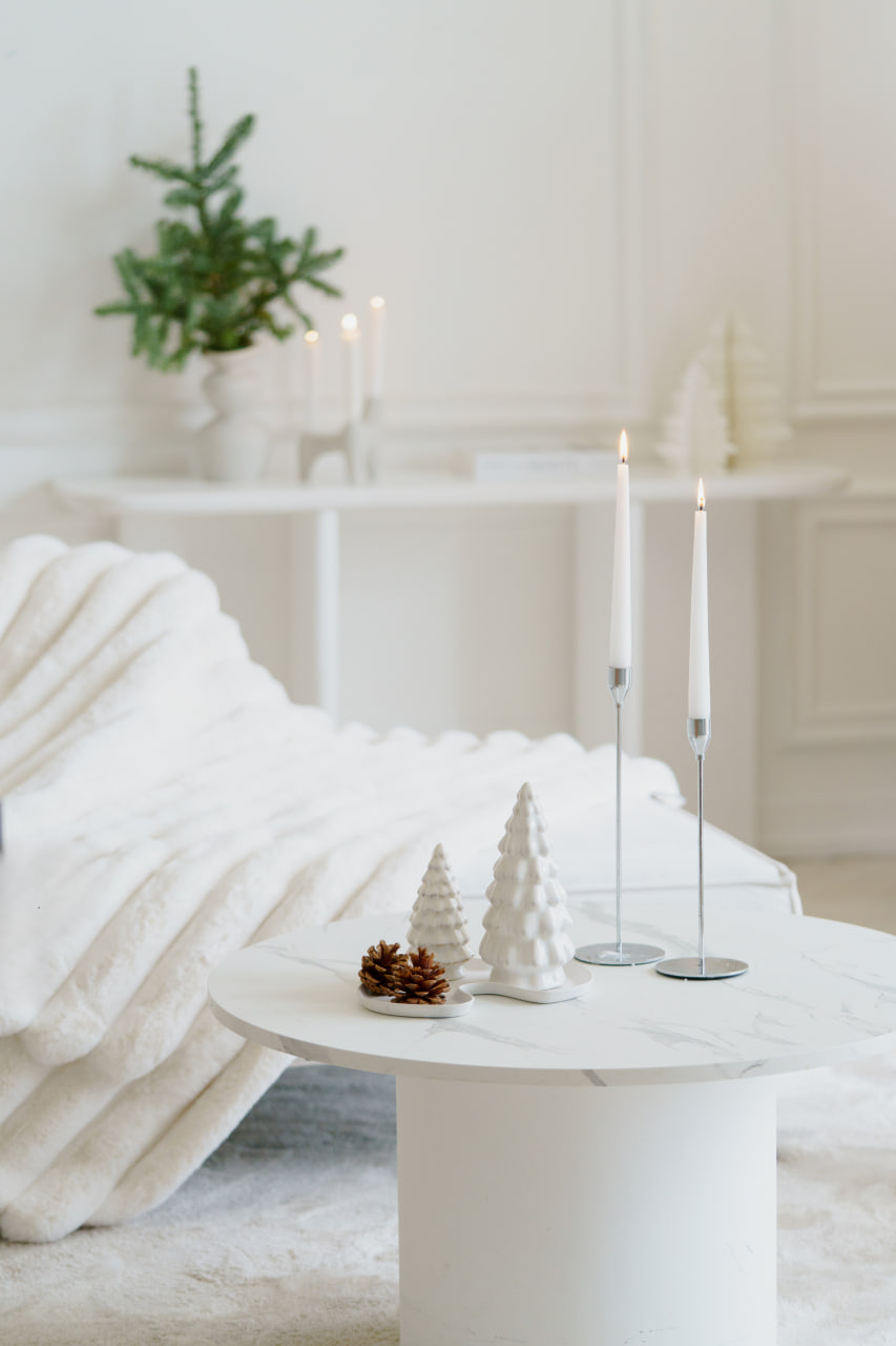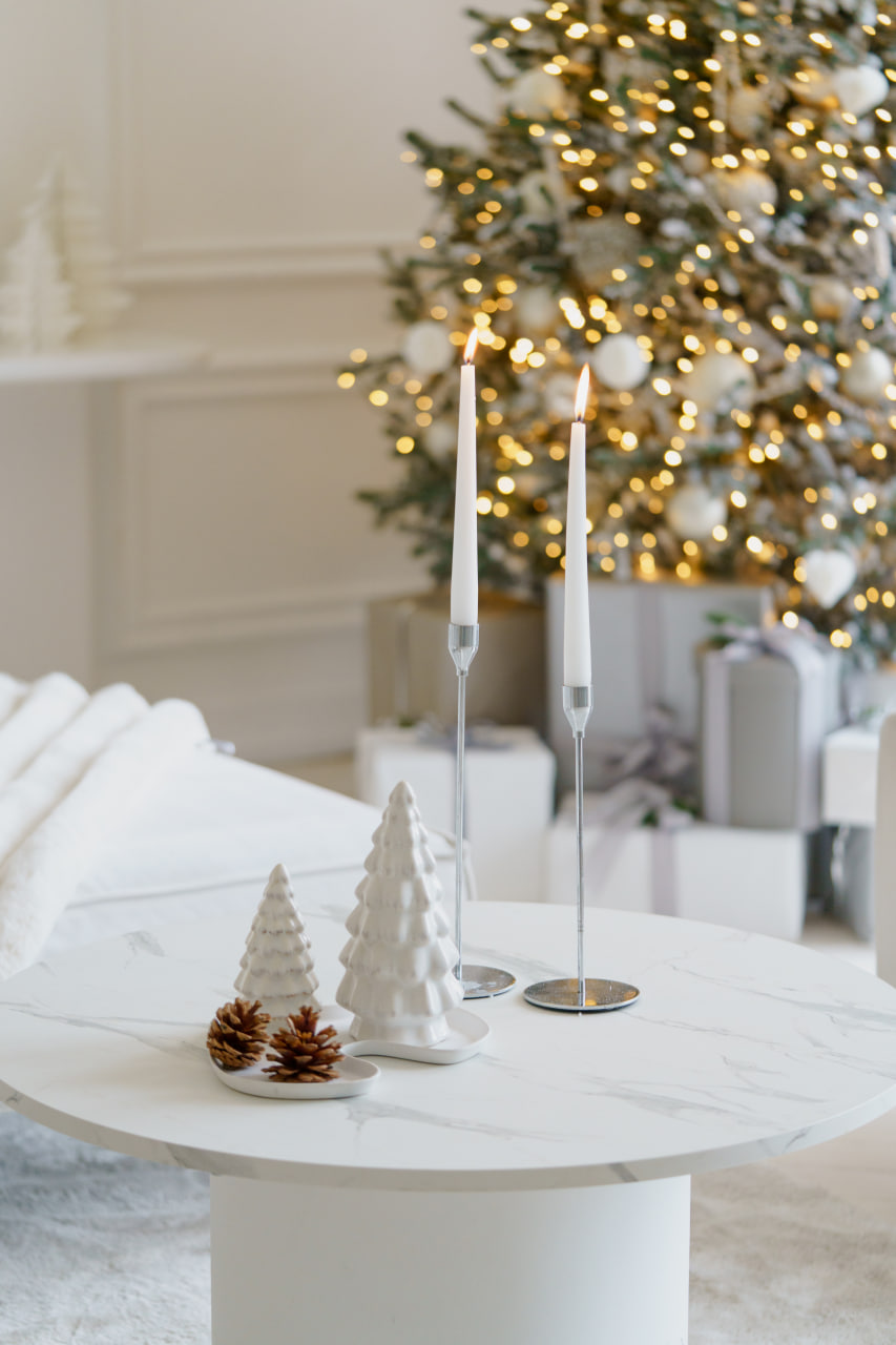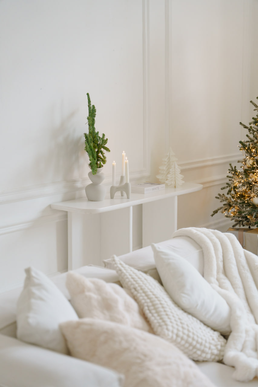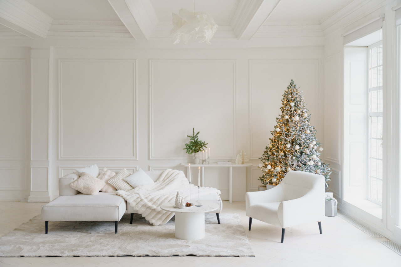 Друга локація – елегантна вітальня з білим диваном та кріслом, ошатною ялинкою, різдвяними подарунками та стильним декором.