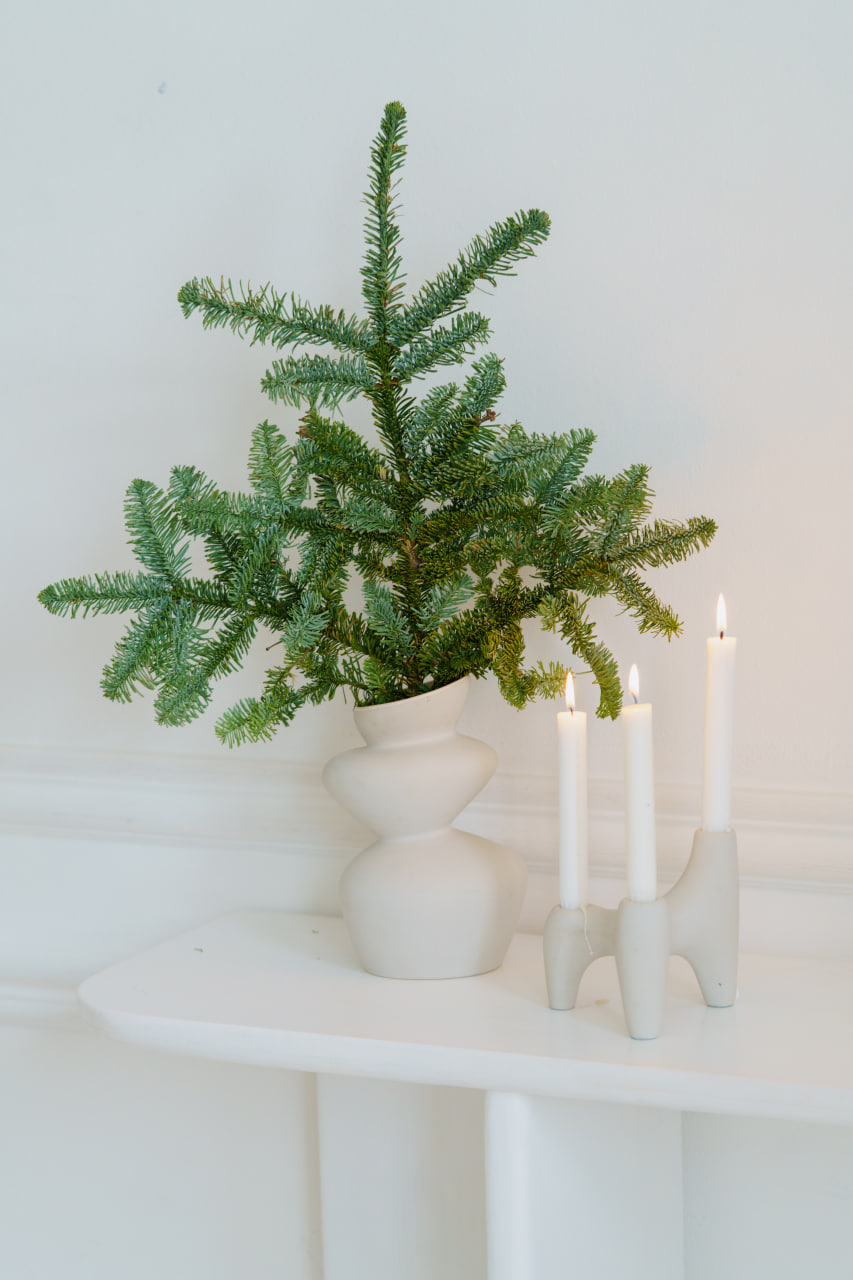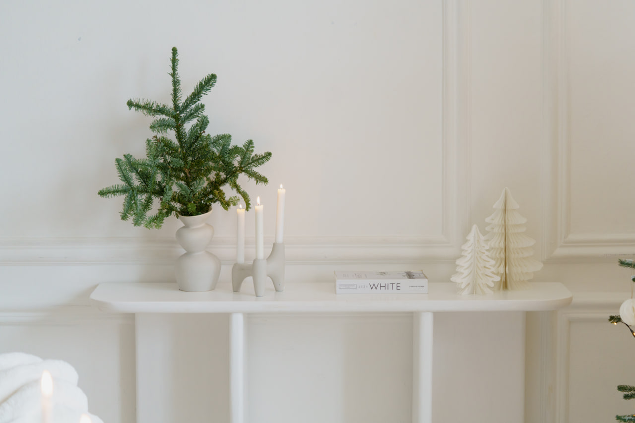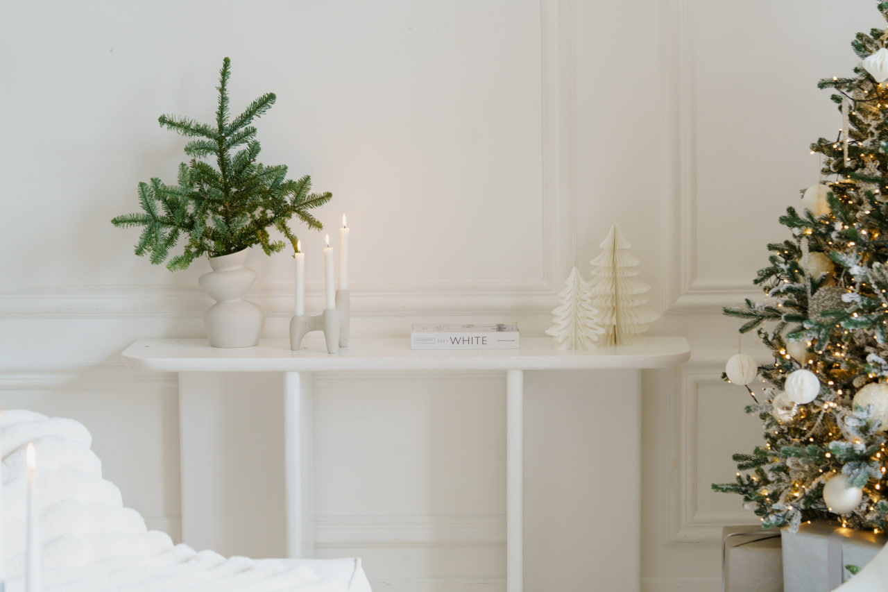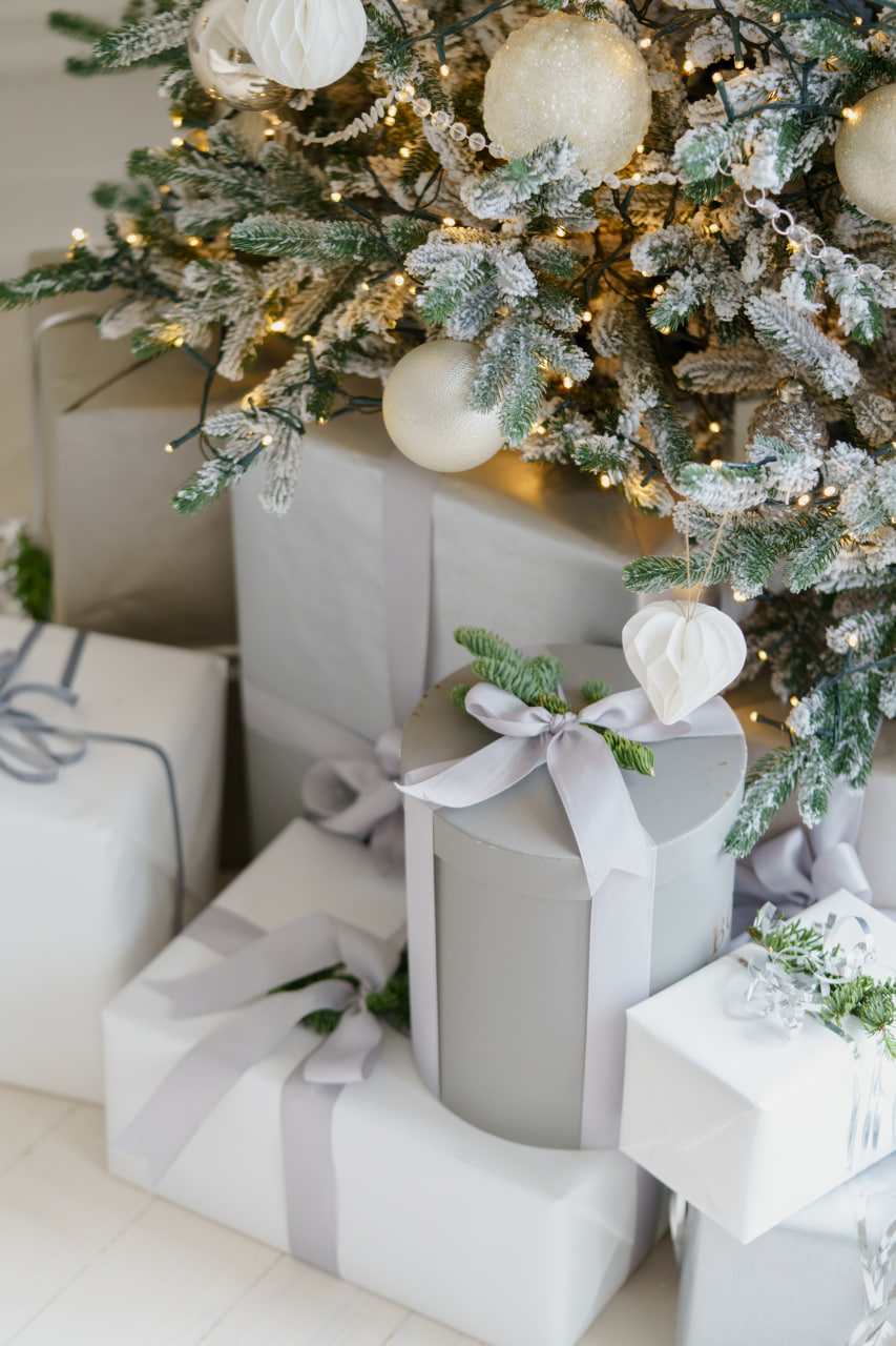 Друга локація – елегантна вітальня з білим диваном та кріслом, ошатною ялинкою, різдвяними подарунками та стильним декором.