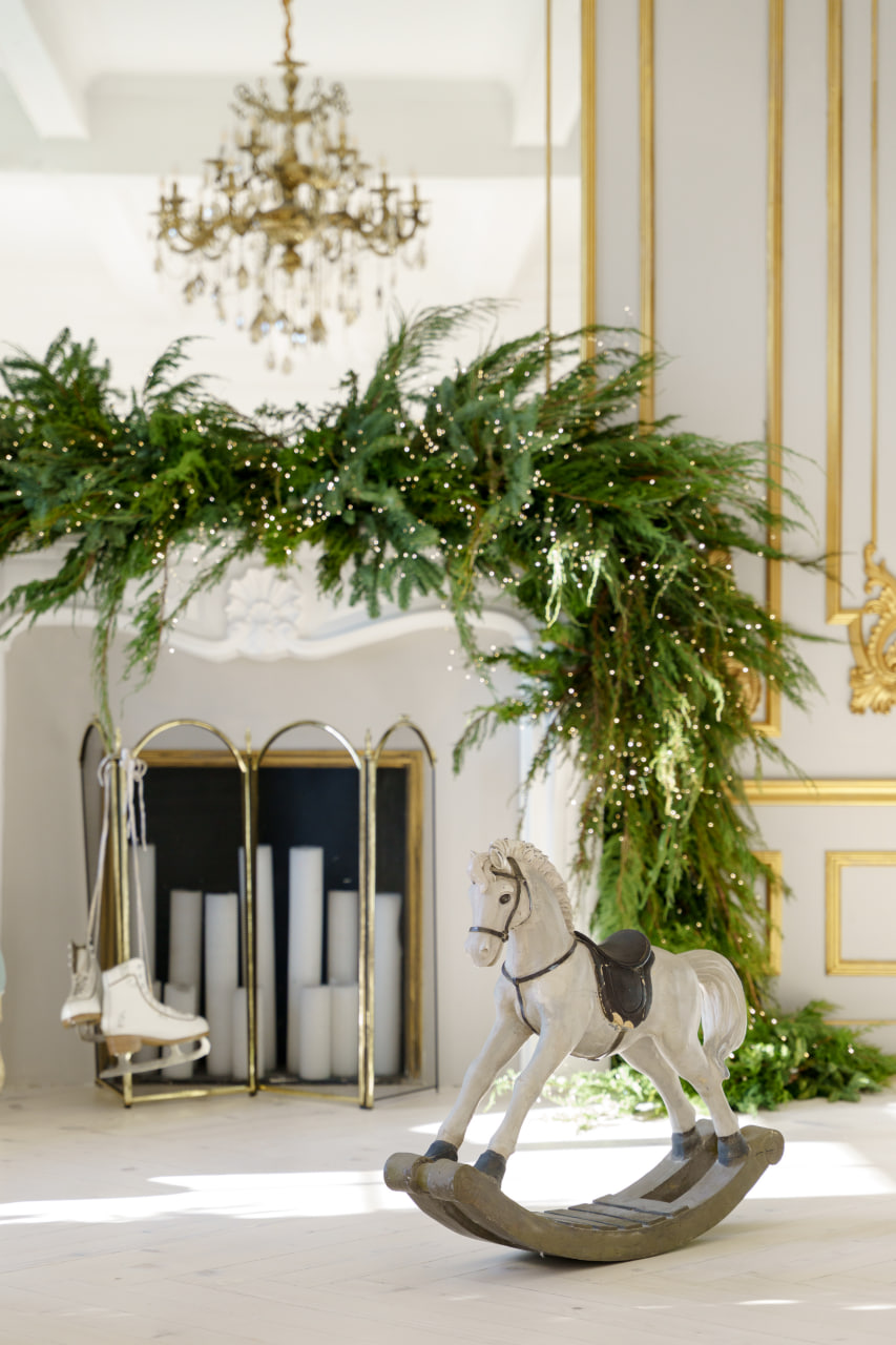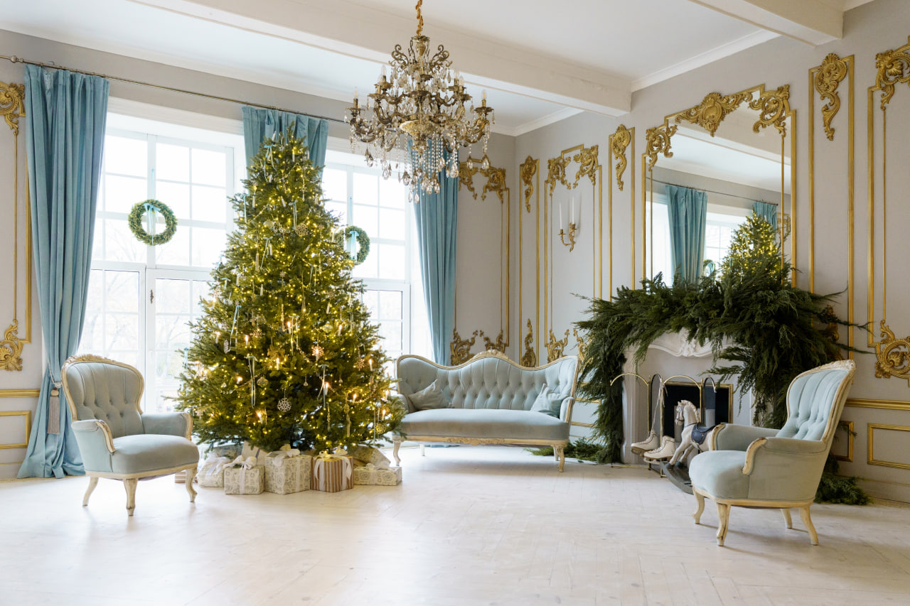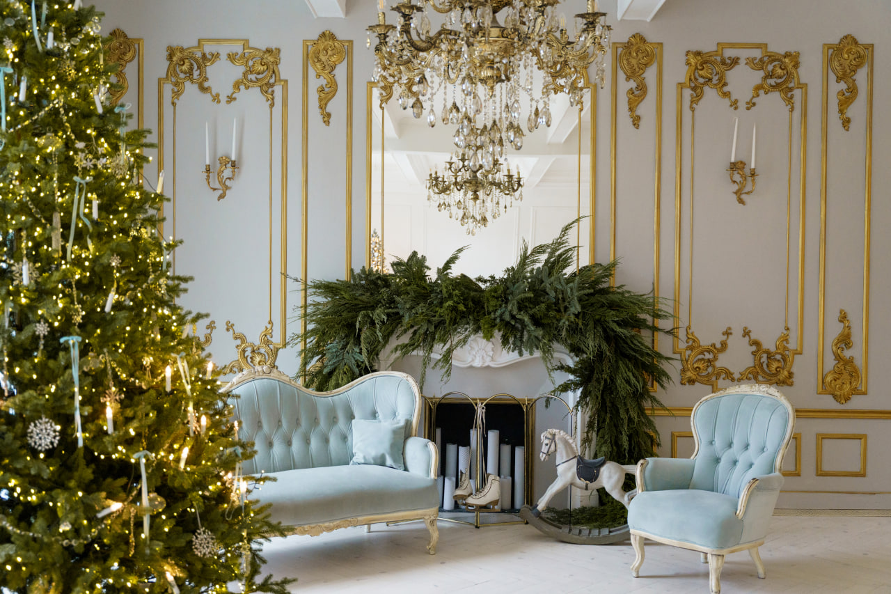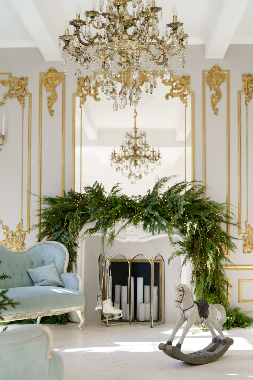 Класична зона з каміном, в естетиці Версалю, шляхетного сірого кольору з позолоченими елементами. Камін, який прикрашено пишною хвойною гірляндою та свічками. Також в цій зоні – велика ялинка у вінтажному стилі.