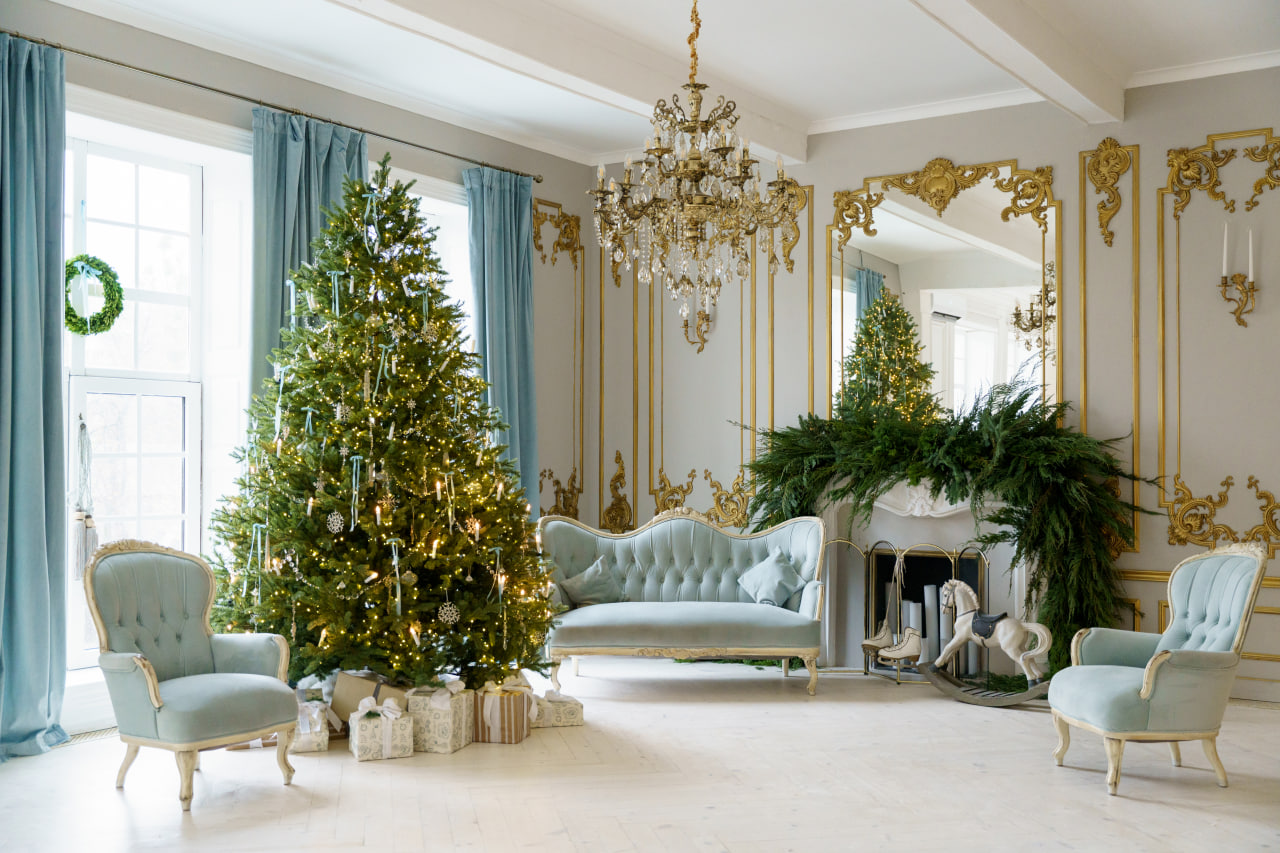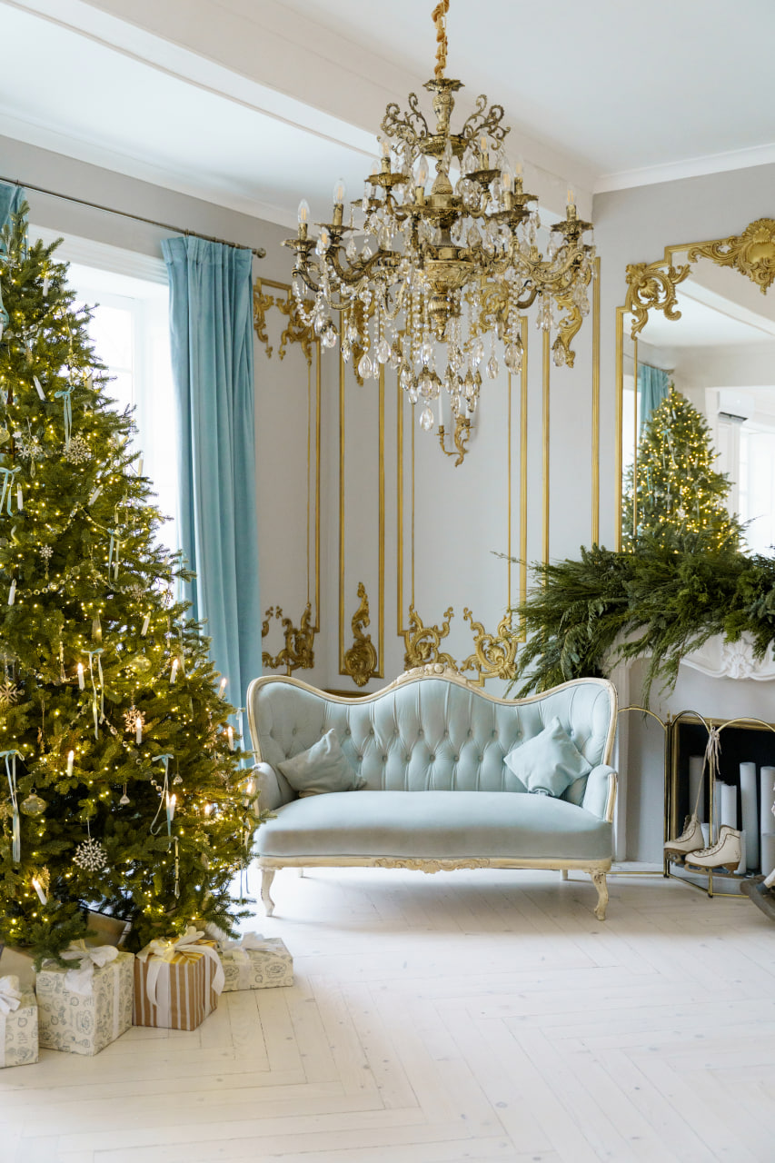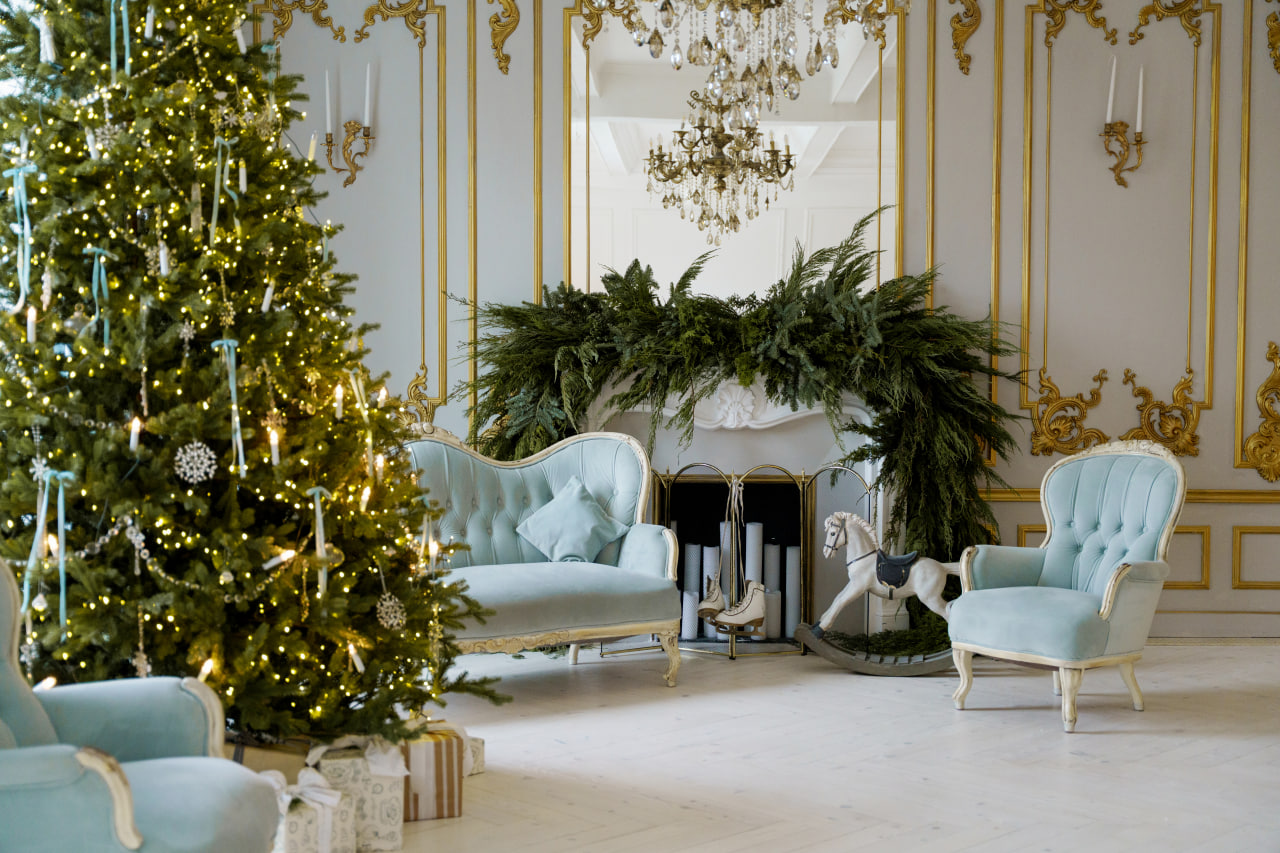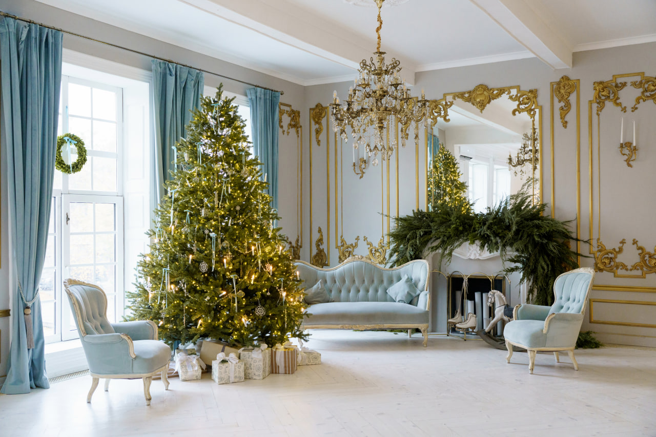Класична зона з каміном, в естетиці Версалю, шляхетного сірого кольору з позолоченими елементами. Камін, який прикрашено пишною хвойною гірляндою та свічками. Також в цій зоні – велика ялинка у вінтажному стилі.