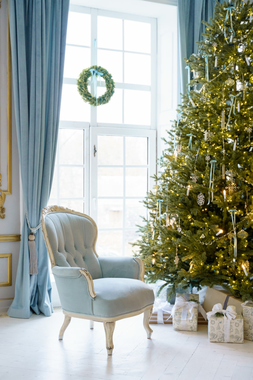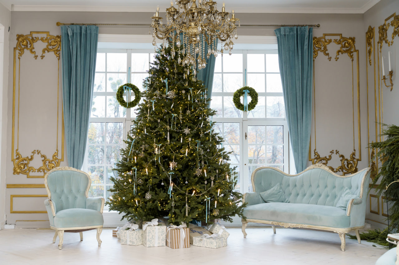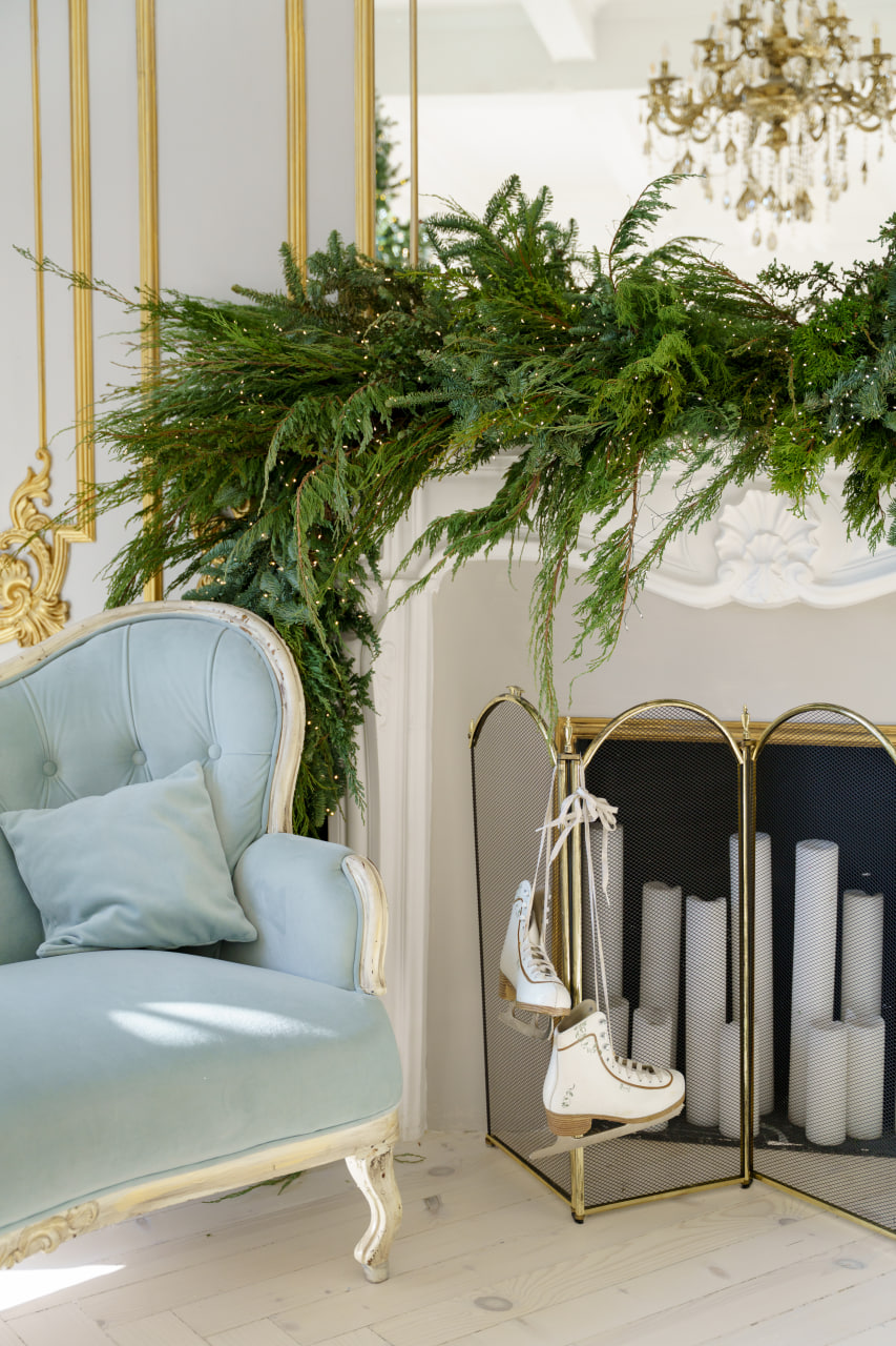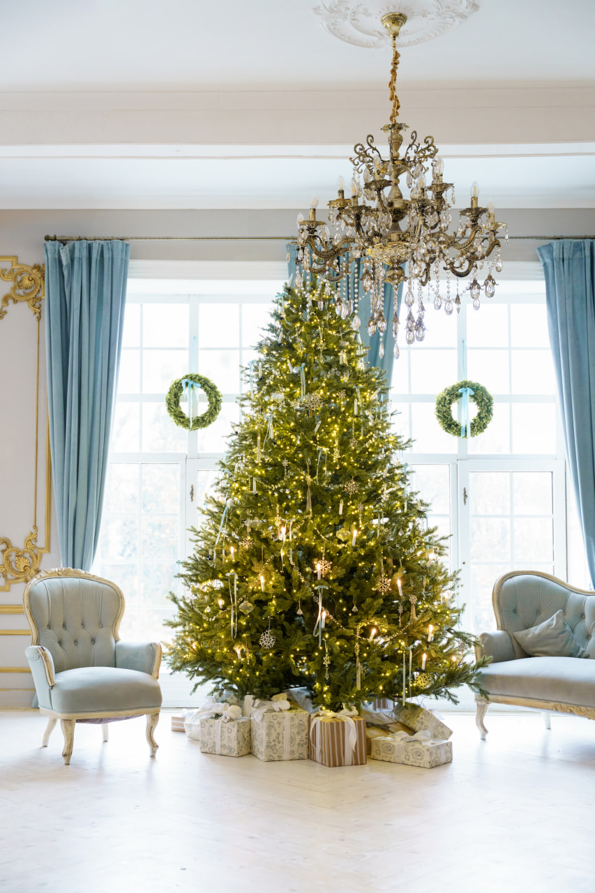 Класична зона з каміном, в естетиці Версалю, шляхетного сірого кольору з позолоченими елементами. Камін, який прикрашено пишною хвойною гірляндою та свічками. Також в цій зоні – велика ялинка у вінтажному стилі.