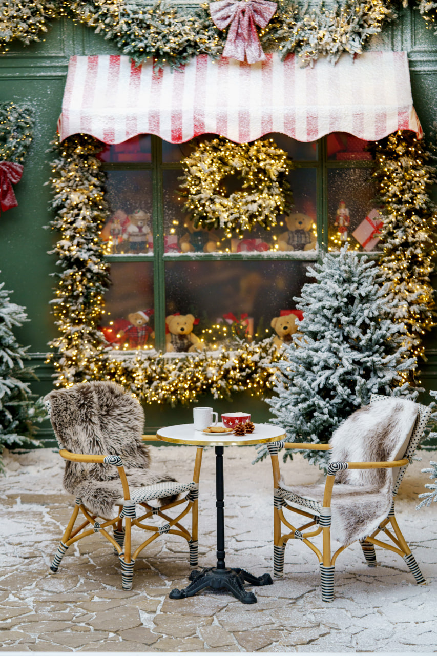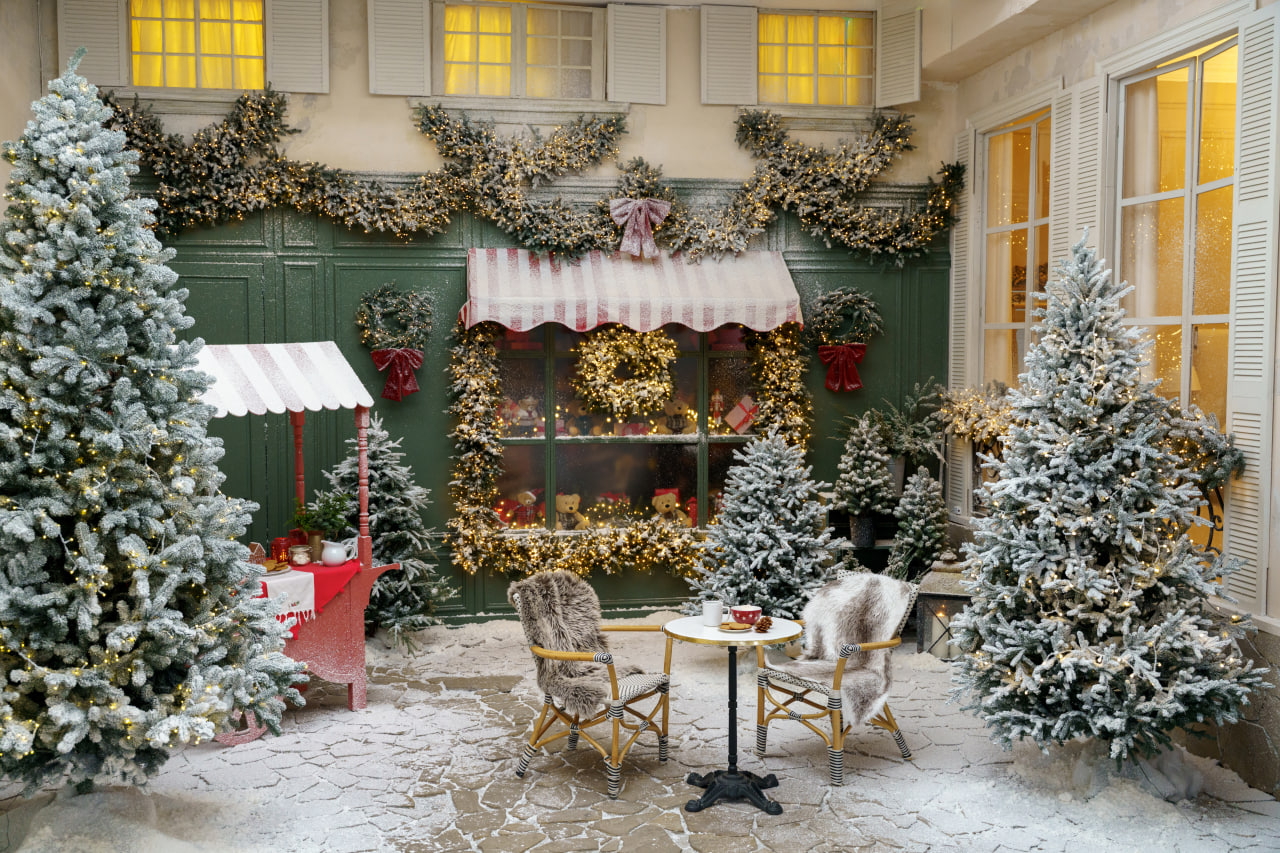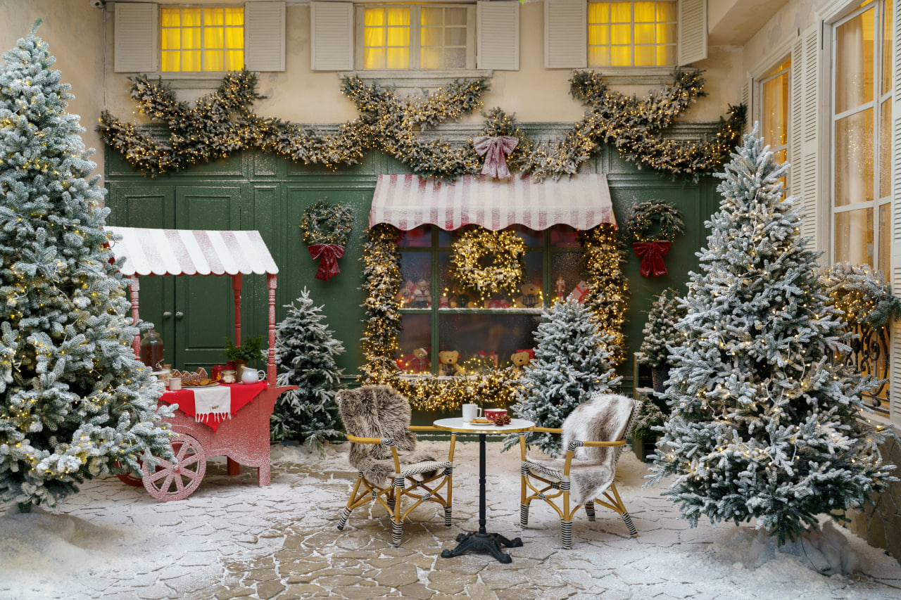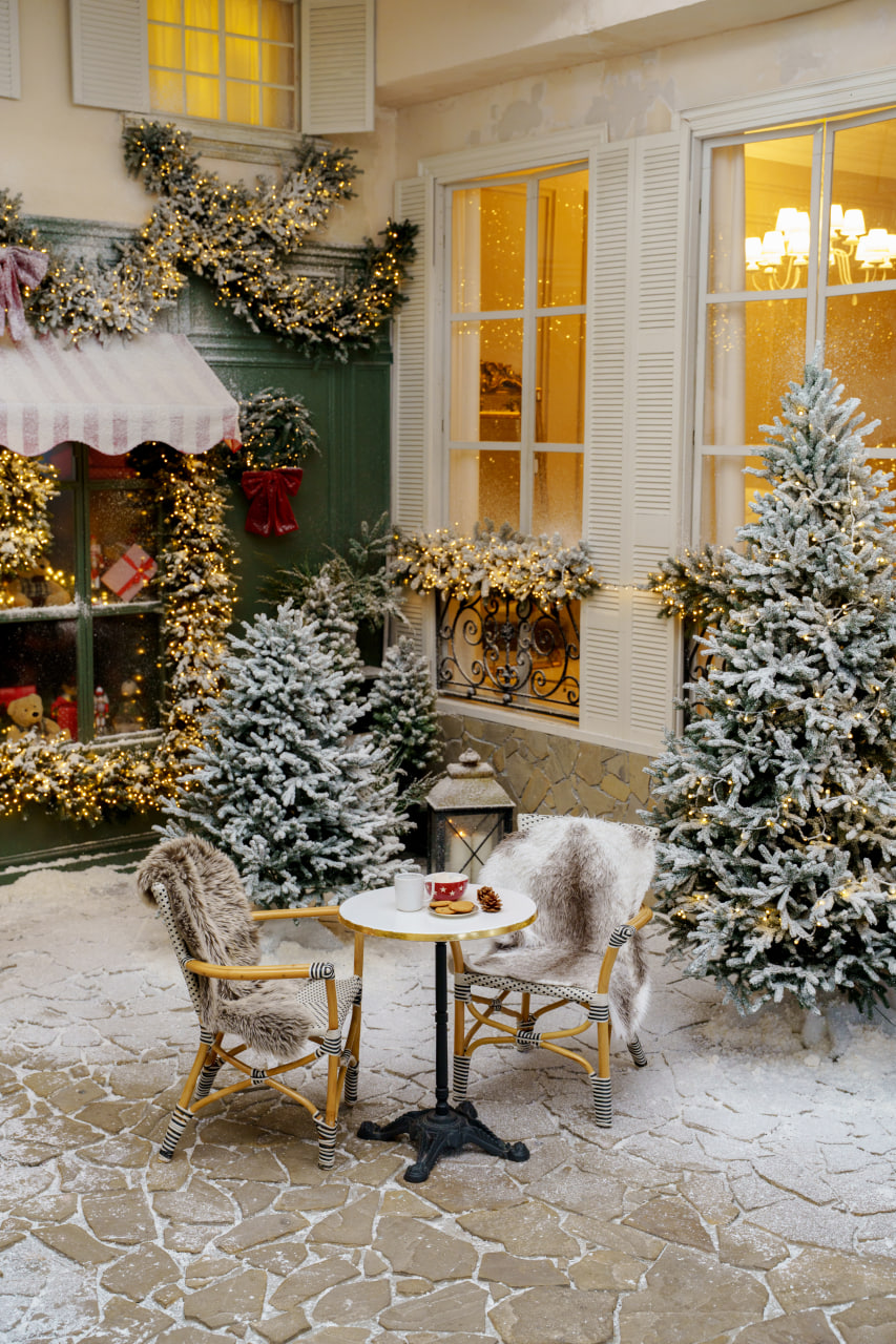 Атмосфера європейського Різдва чекає в засніженій зоні з кавʼярнею. Зелений фасад французького кафе з вітриною та біло-червоними маркізами. Ялинки, візок з гарячим какао, різноманітний декор та казкові вогники гірлянд.
