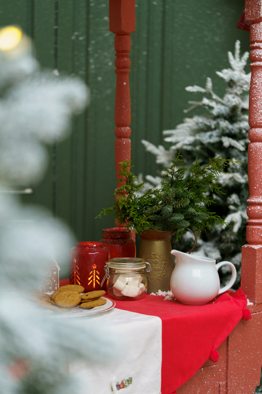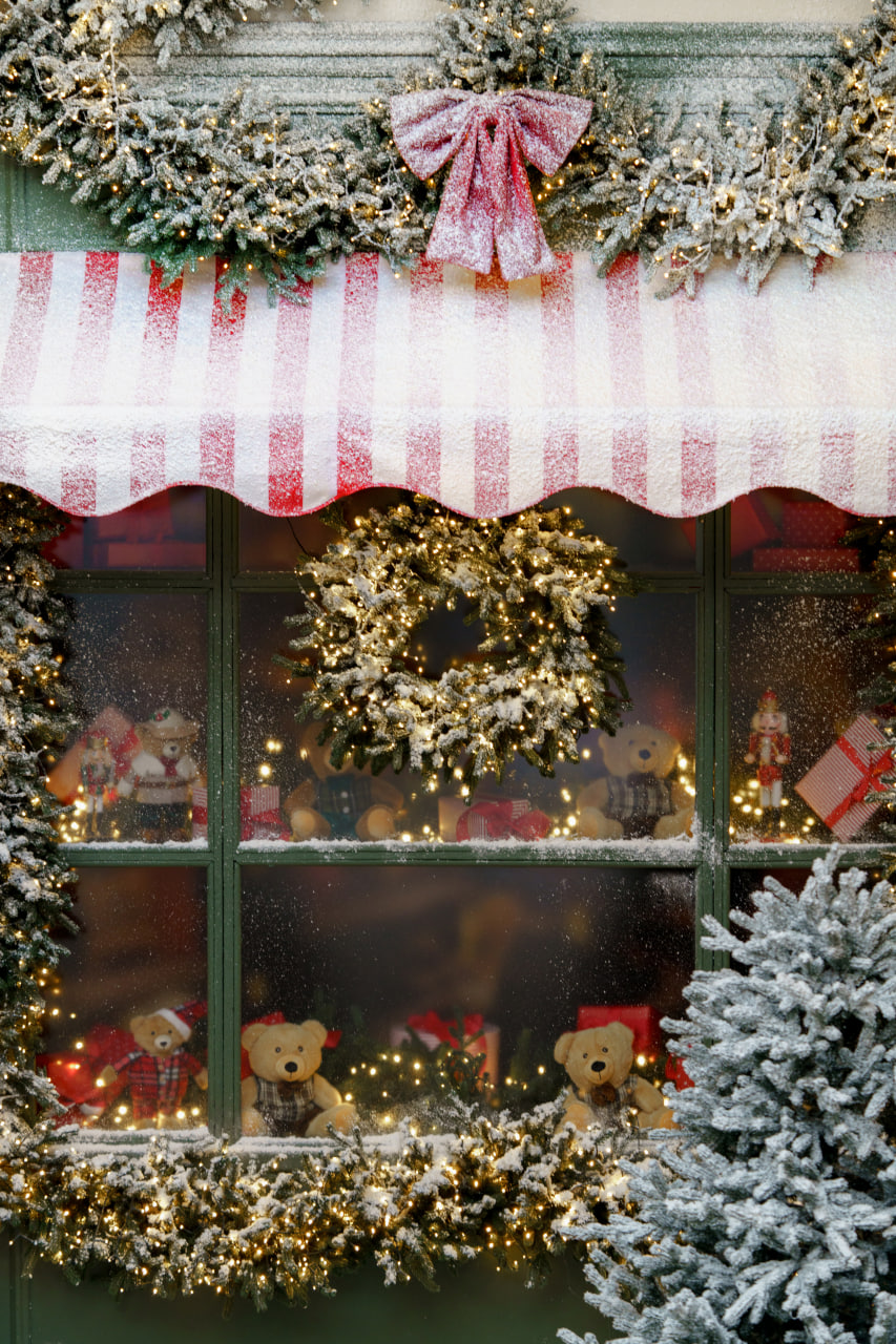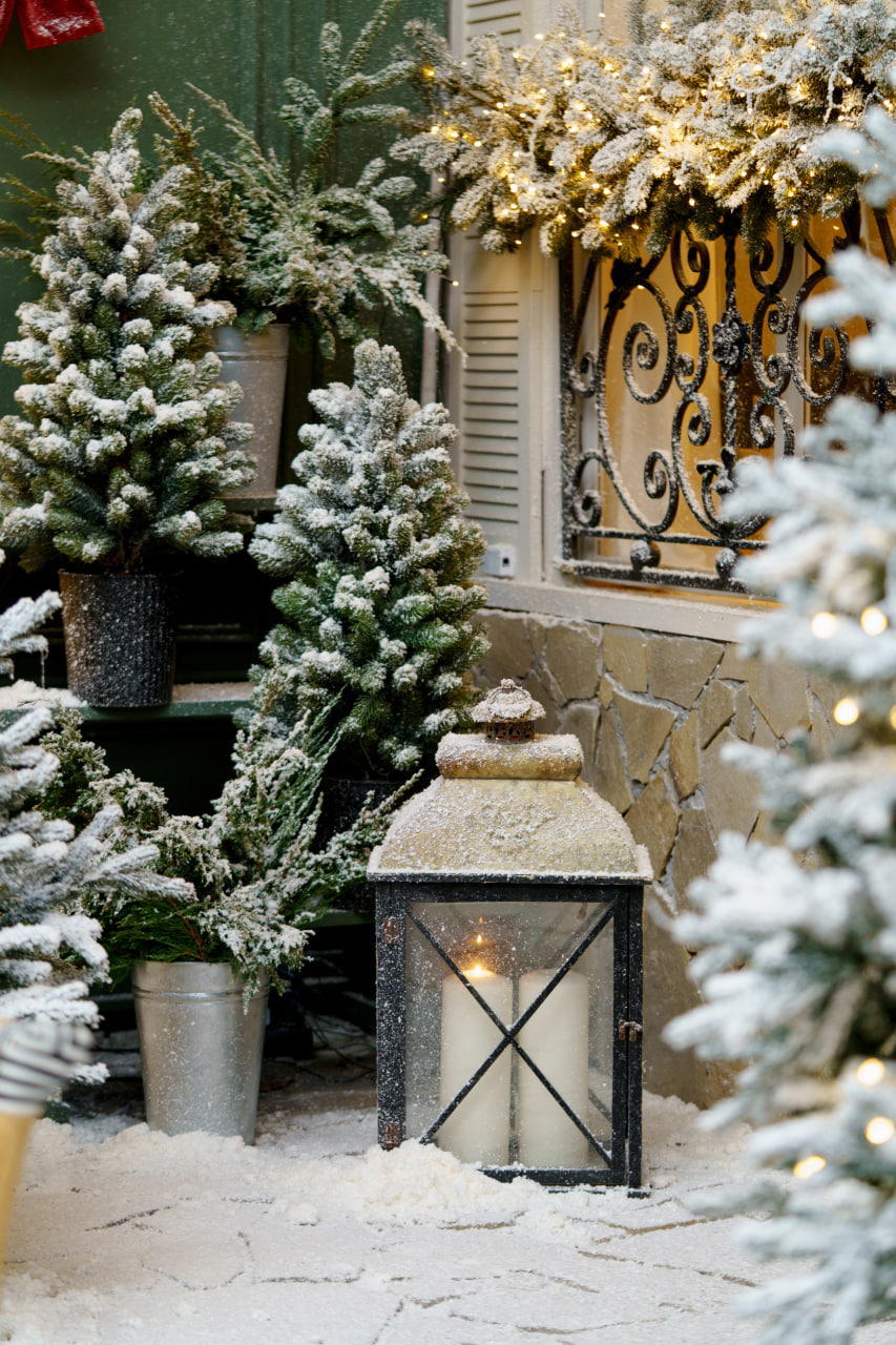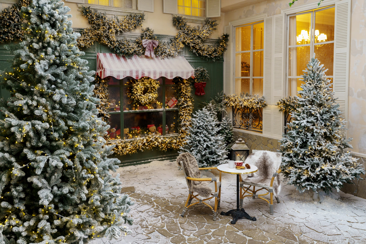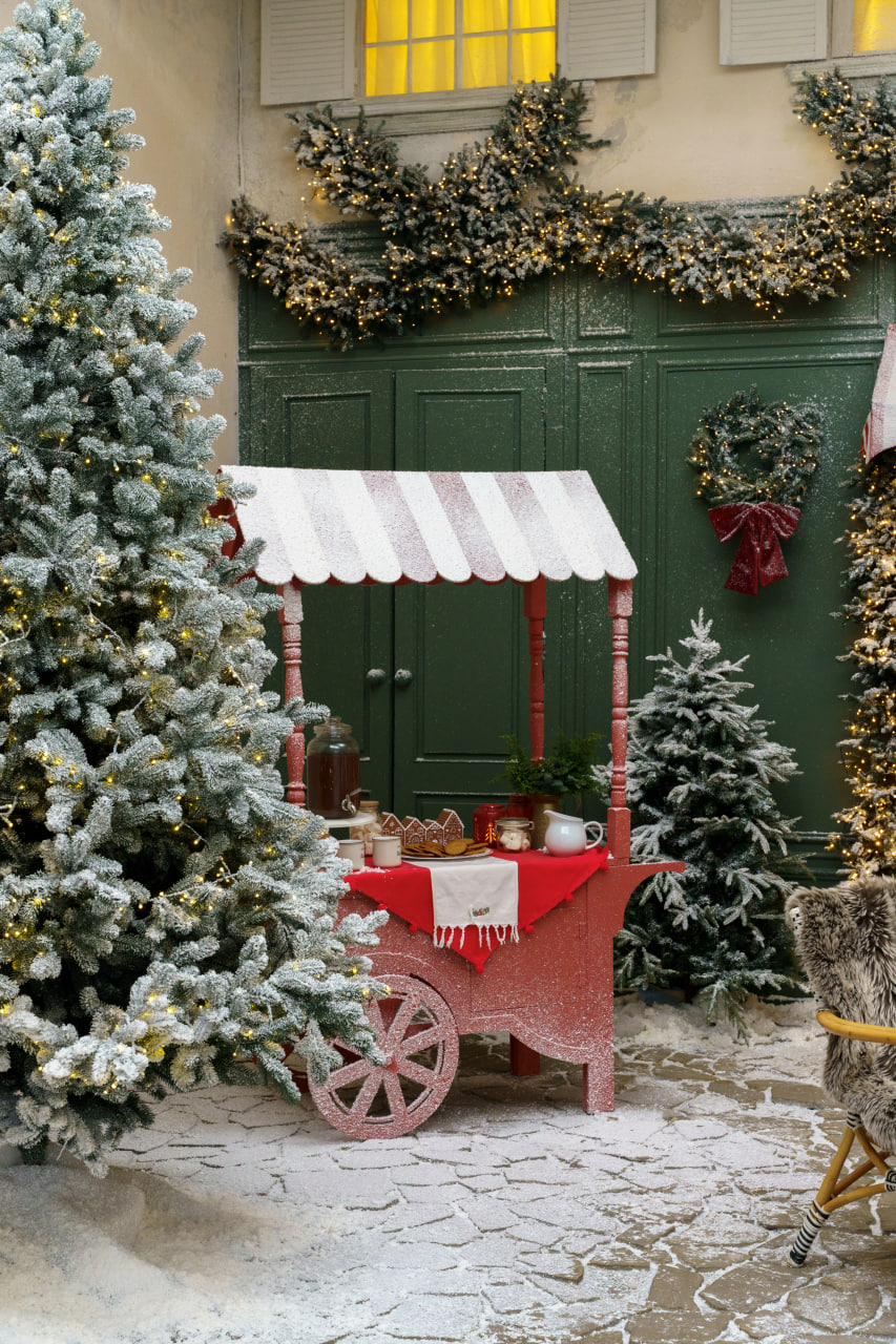 Атмосфера європейського Різдва чекає в засніженій зоні з кавʼярнею. Зелений фасад французького кафе з вітриною та біло-червоними маркізами. Ялинки, візок з гарячим какао, різноманітний декор та казкові вогники гірлянд.