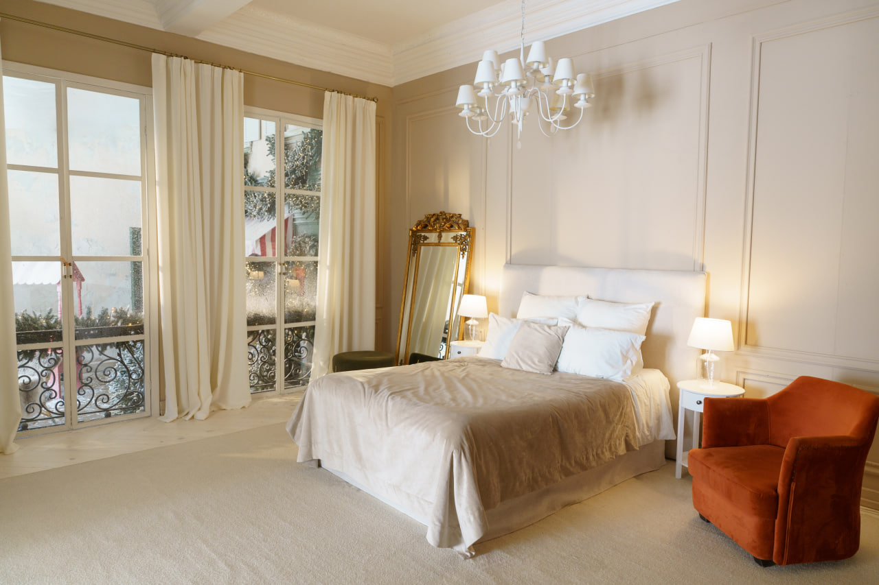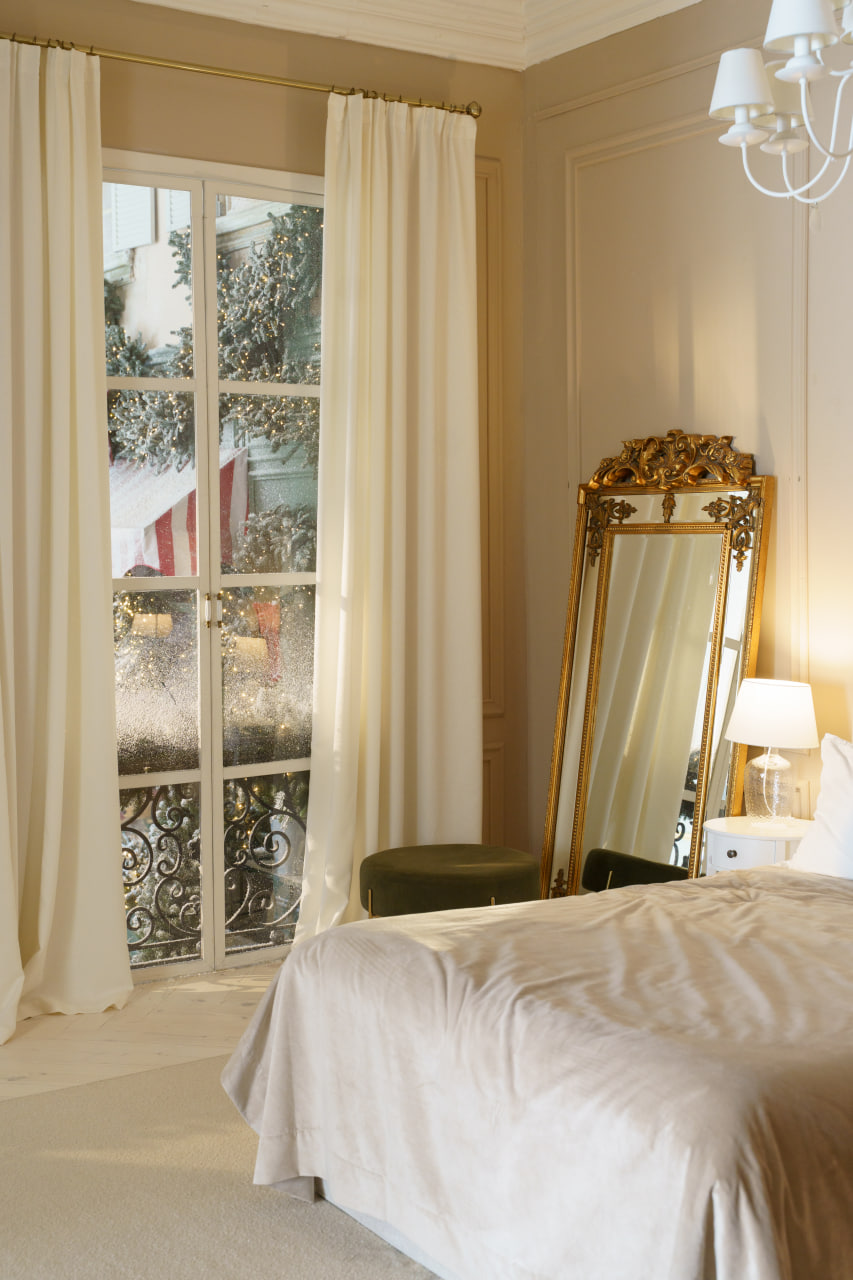 Ще одна зона – вишукана спальня в пастельних кольорах, з французьким вікном і неймовірним виглядом на засніжену кавʼярню.