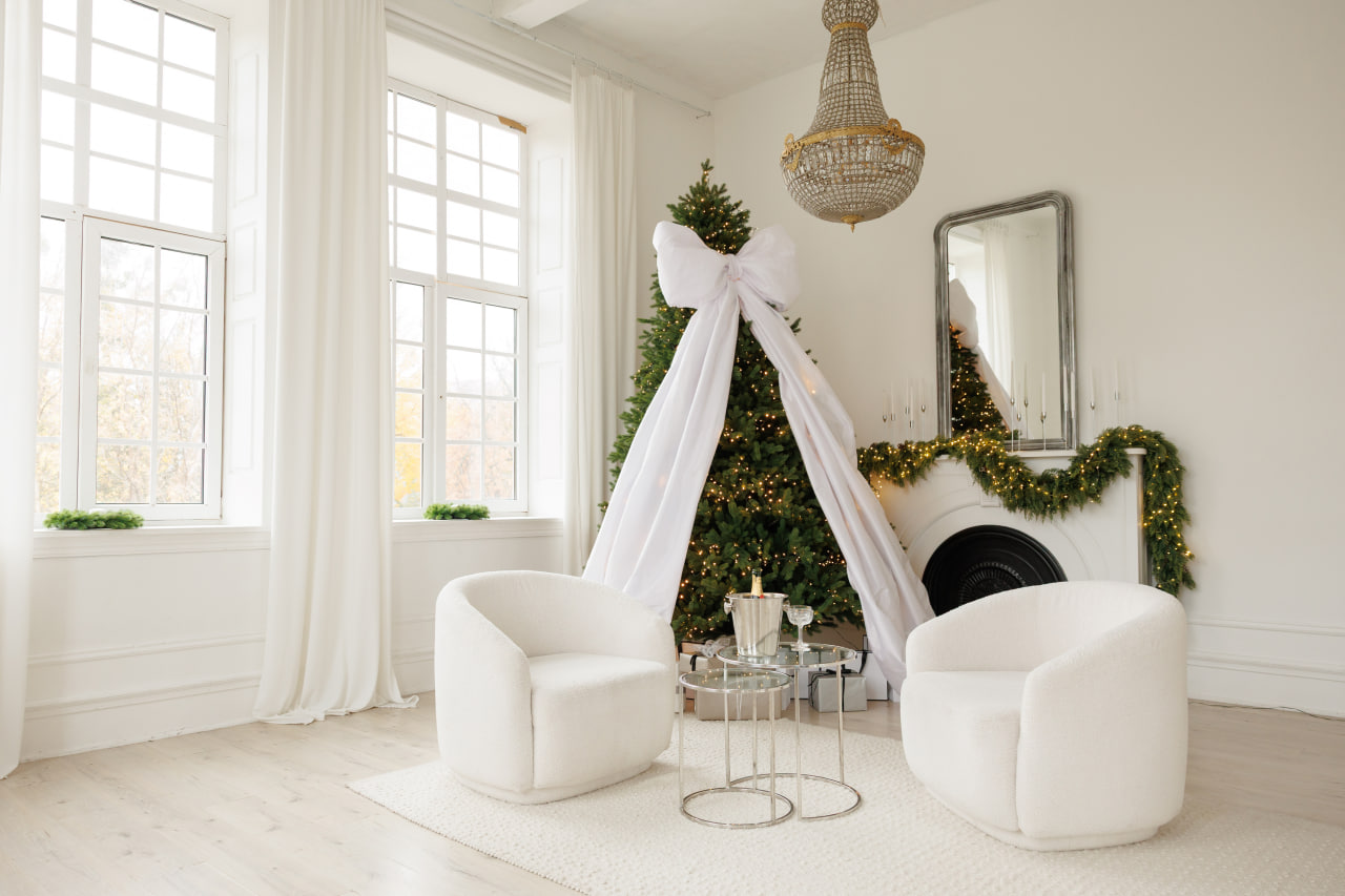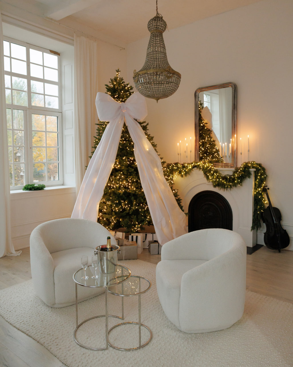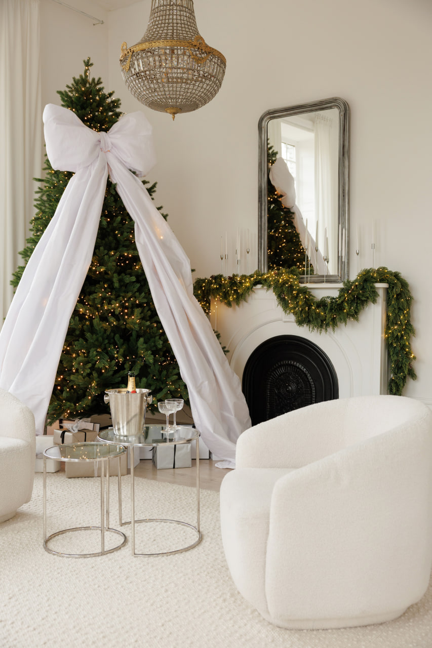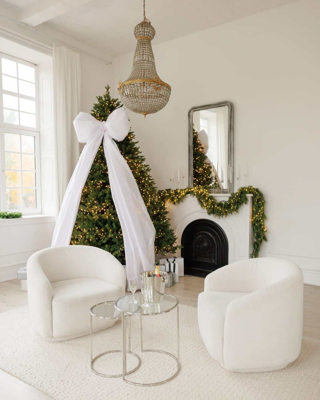 У першій зоні — поєднання старовинного каміну й розкішної люстри із трендовими меблями та декором. Святкова ялинка прикрашена величезним білим бантом.