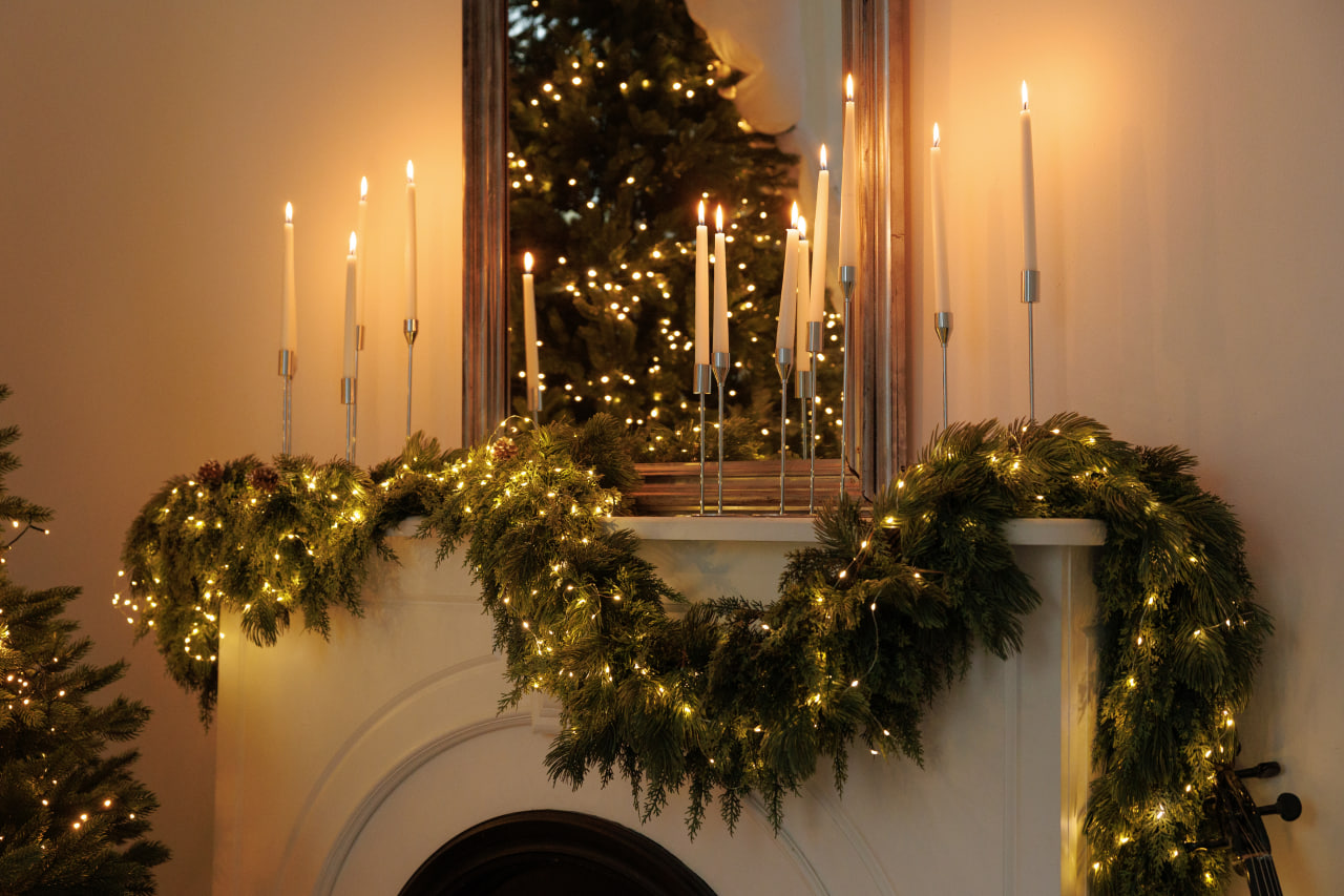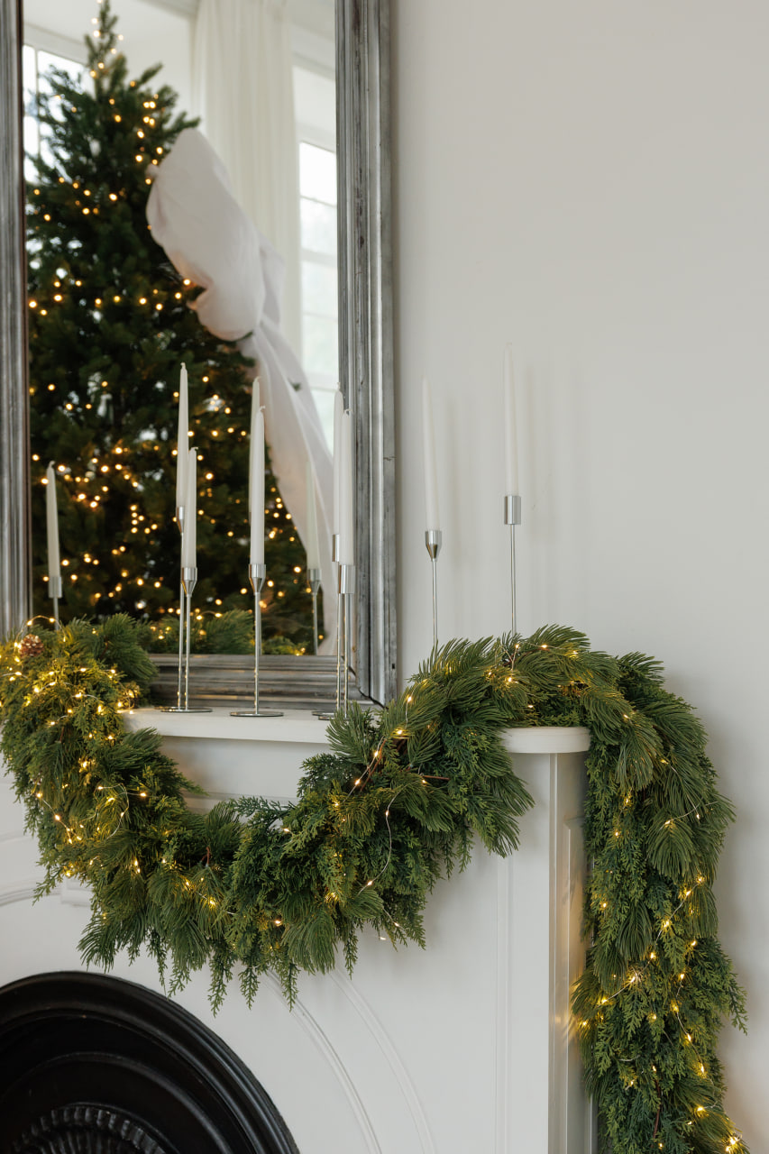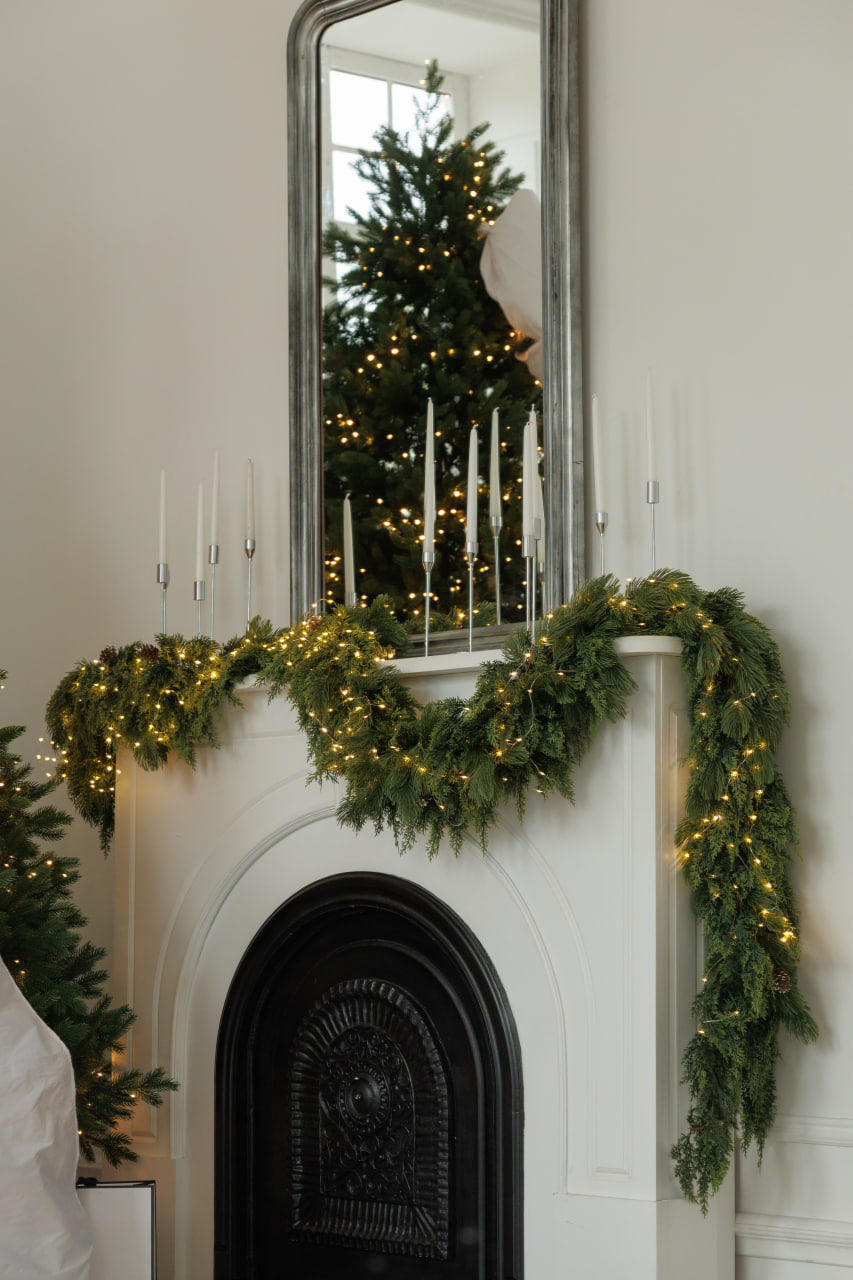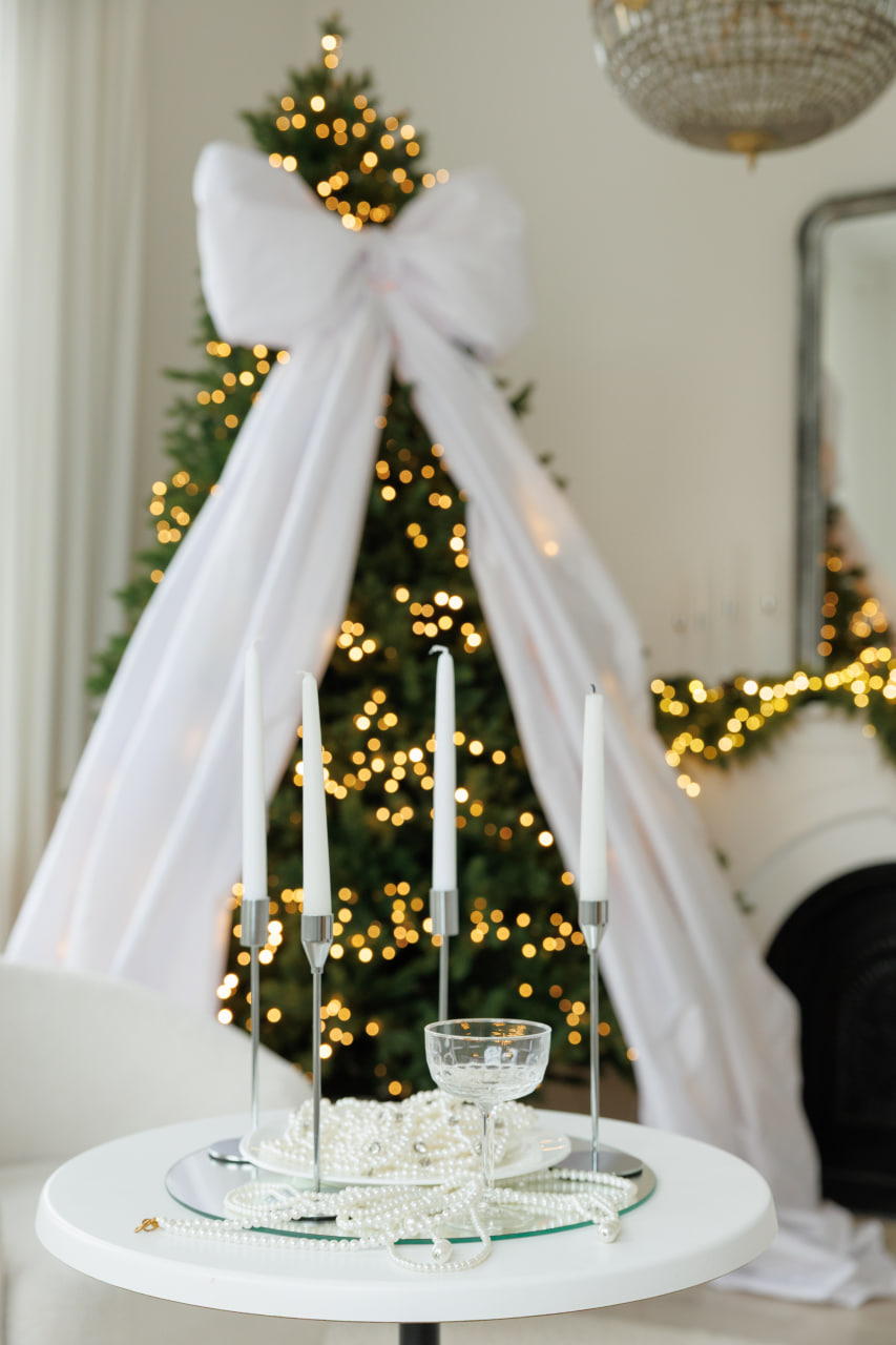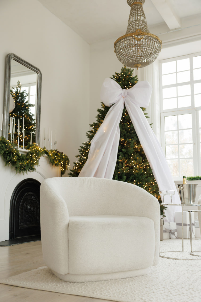 У першій зоні — поєднання старовинного каміну й розкішної люстри із трендовими меблями та декором. Святкова ялинка прикрашена величезним білим бантом.
