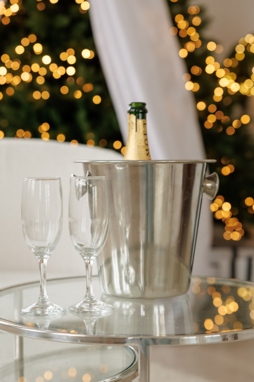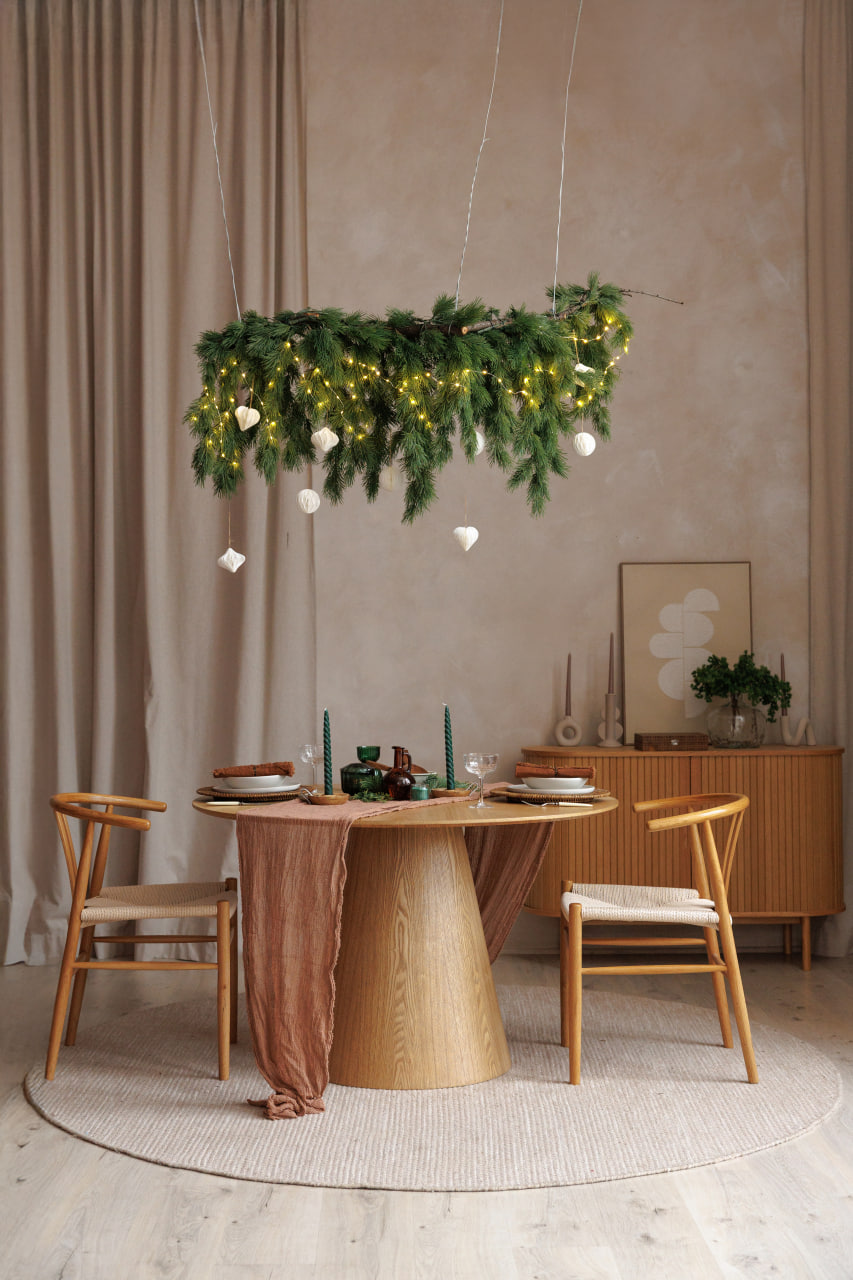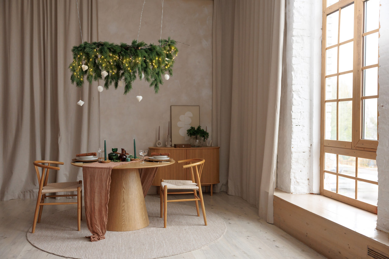 Третя зона — вишукана та лаконічна, у спокійних нюдових кольорах, із великим круглим столом та різдвяним декором.