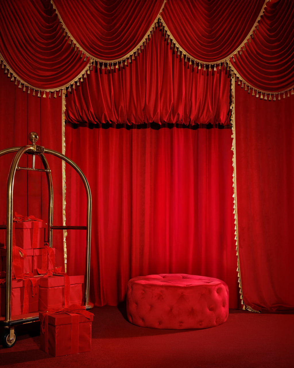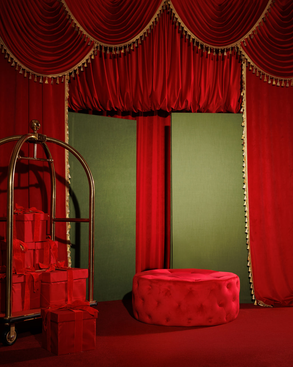 Друга зона — нова, ефектна та багатофункціональна. Вона може виглядати як циркове шатро або тотал ред фешн-зона — простір для вашої фантазії. Тут є: великий червоний пуф, зелена ширма, візок портьє і гойдалка.