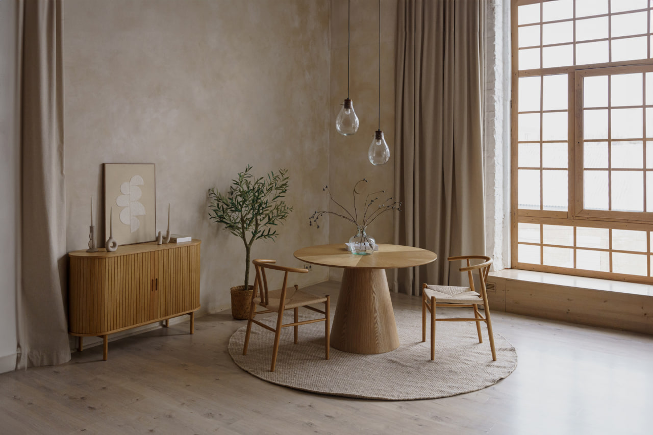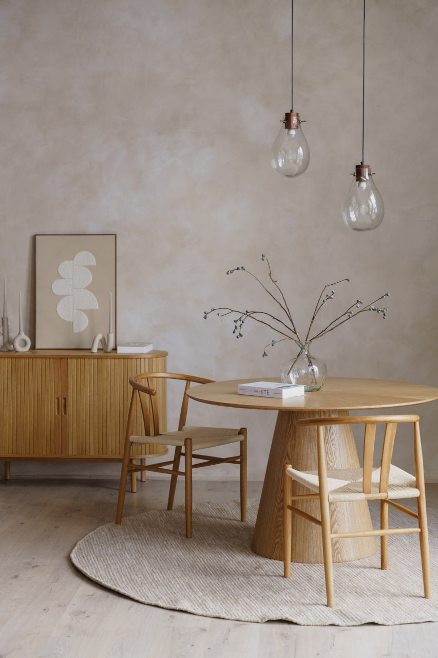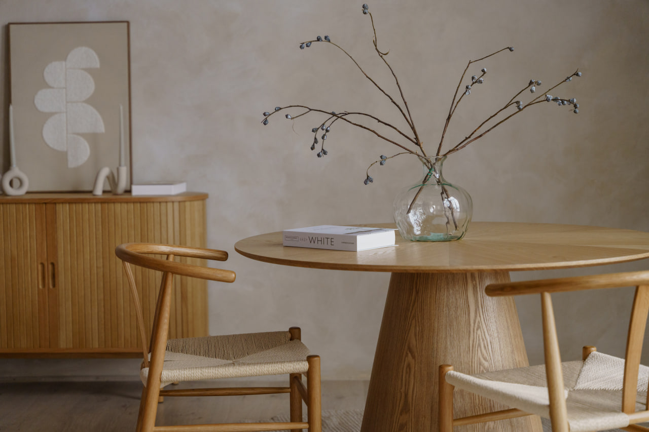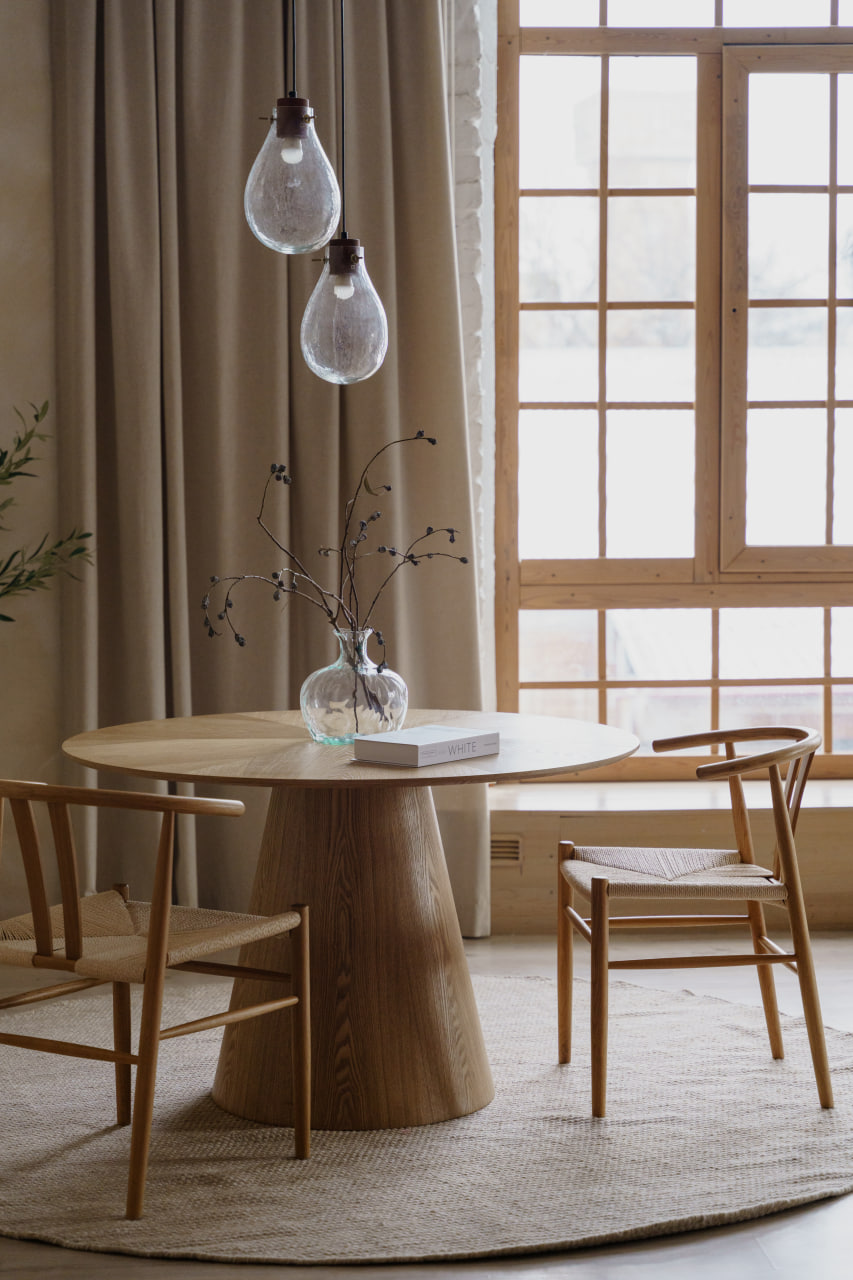 Третя зона – вишукана й лаконічна: спокійна нюдова палітра, великий круглий стіл та стільці, і стильний, стриманий декор.