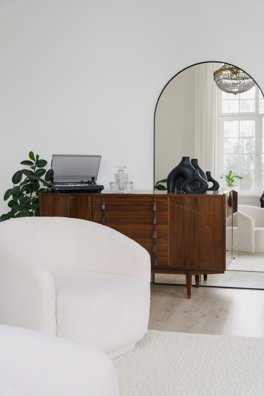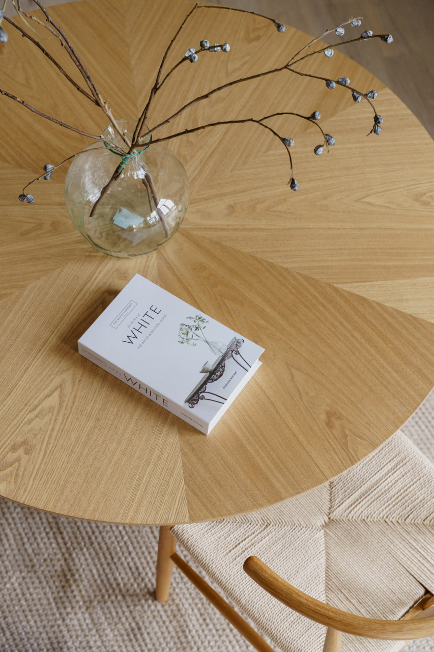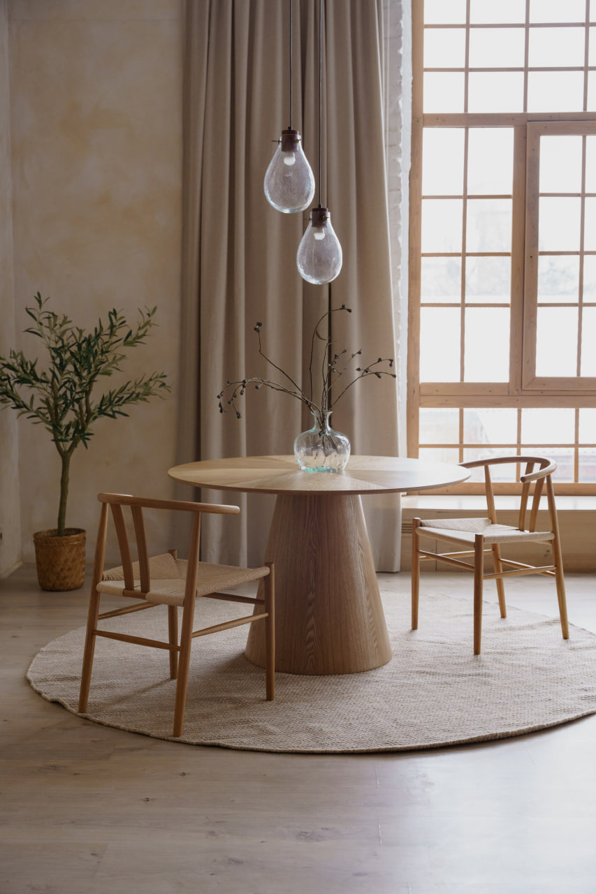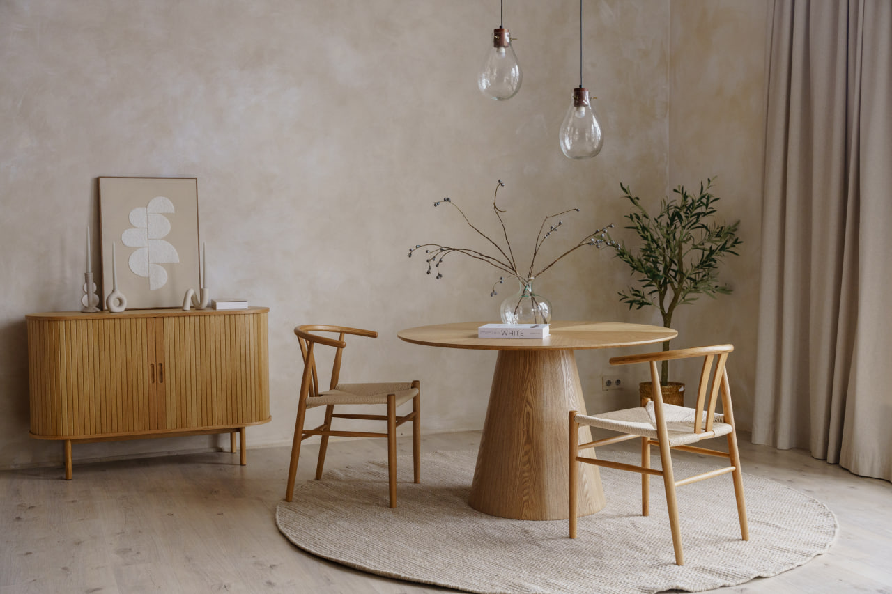 Третя зона – вишукана й лаконічна: спокійна нюдова палітра, великий круглий стіл та стільці, і стильний, стриманий декор.