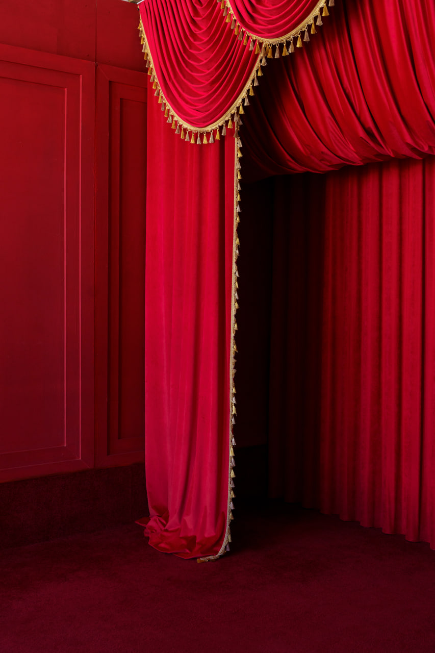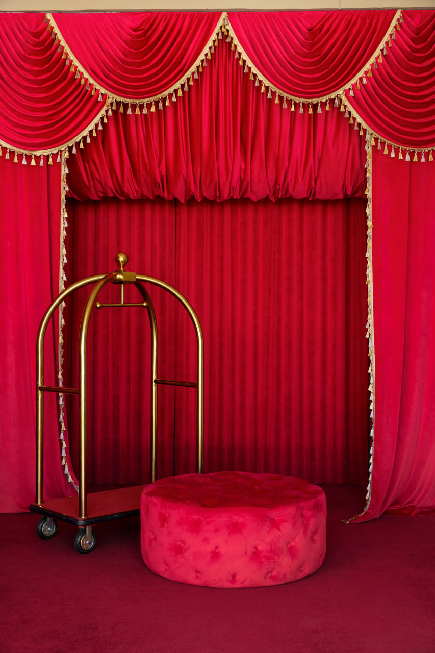 Вона легко трансформується від циркового шатра до Total Red фешн-зони. Це простір для різних сценаріїв. Для зйомок тут: червоні портьєри, великий червоний пуф, зелена ширма, яку можна переставляти, візок портьє.