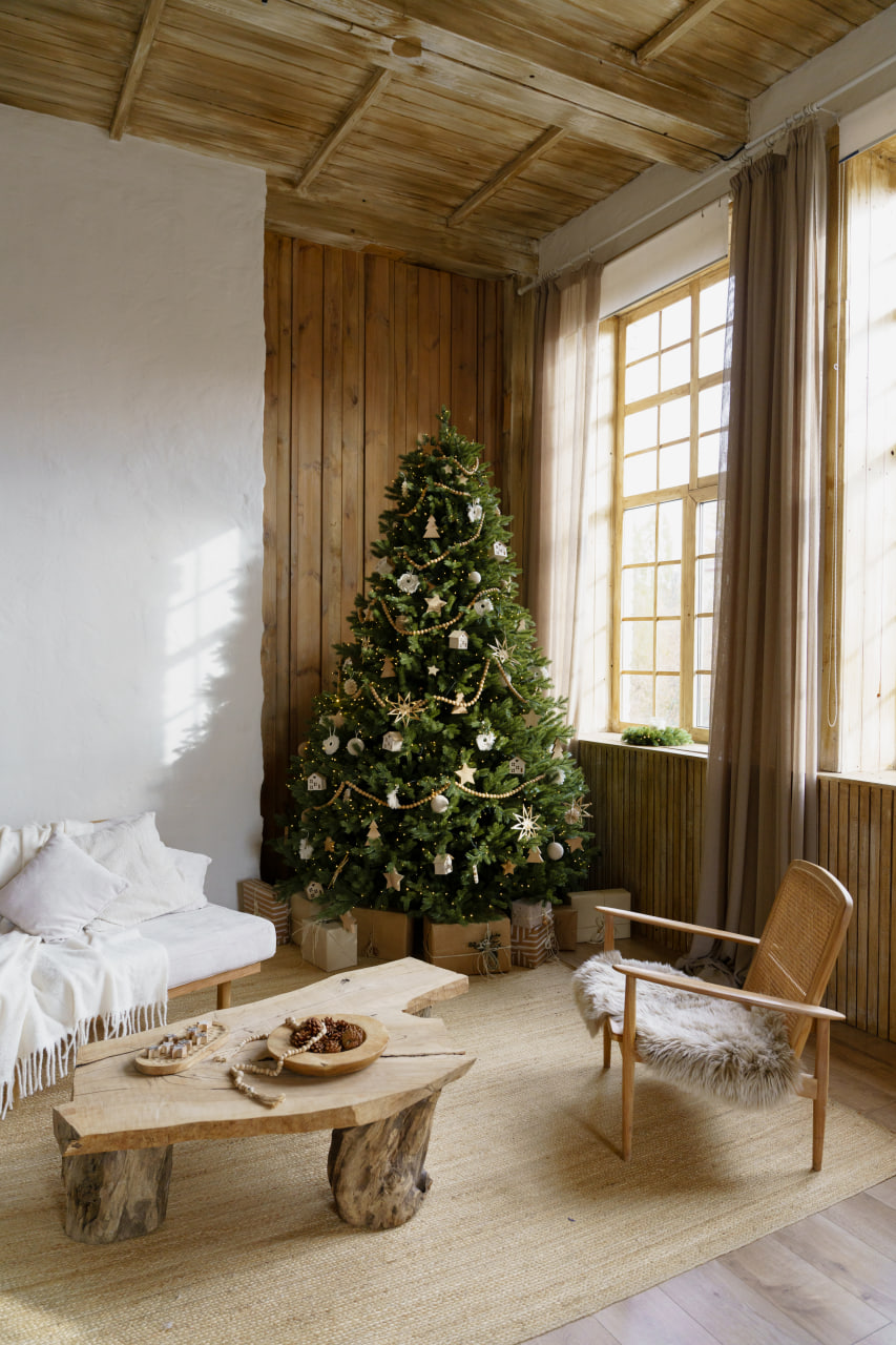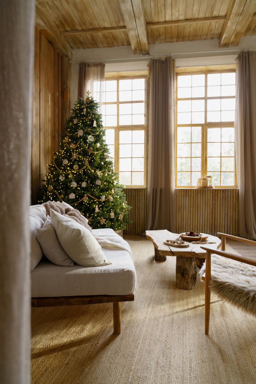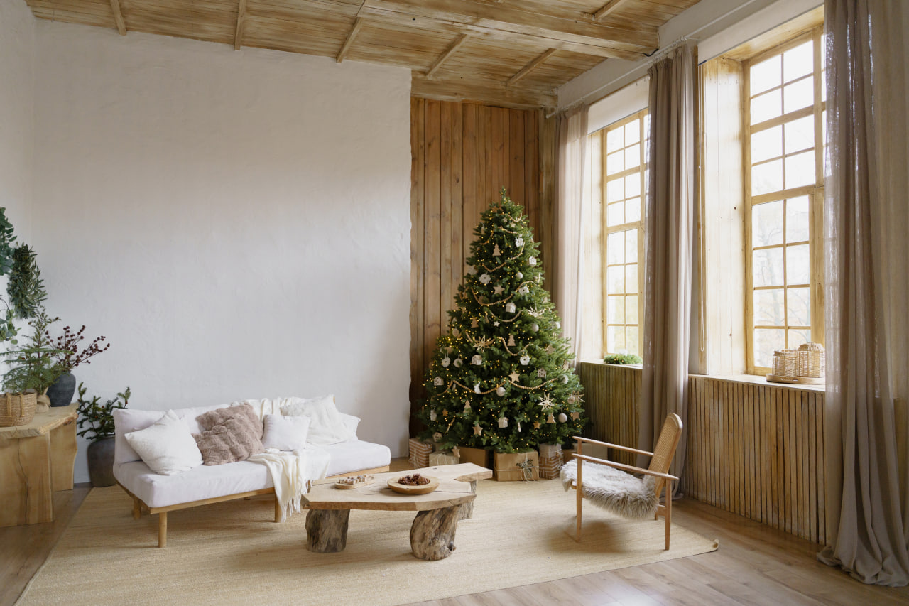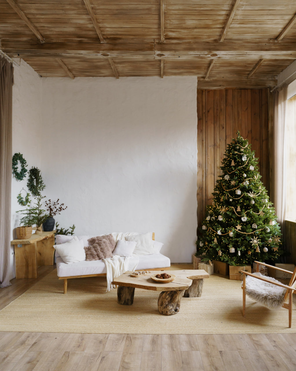 В першій зоні: натуральні матеріали та спокійні кольори, живі фактури дерева й тканини, світлий диван з подушками, крісло, велика ялинка та різдвяний декор.