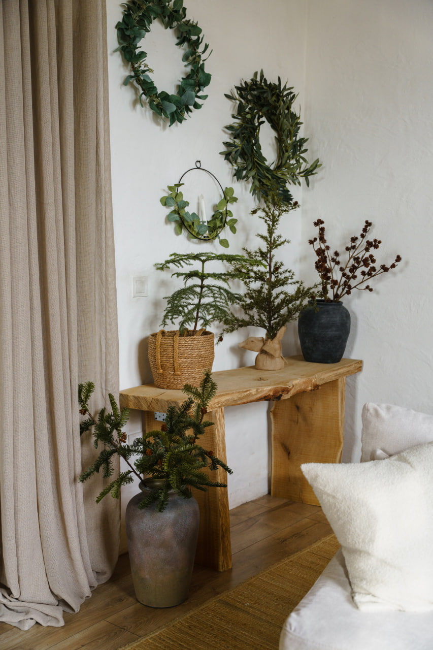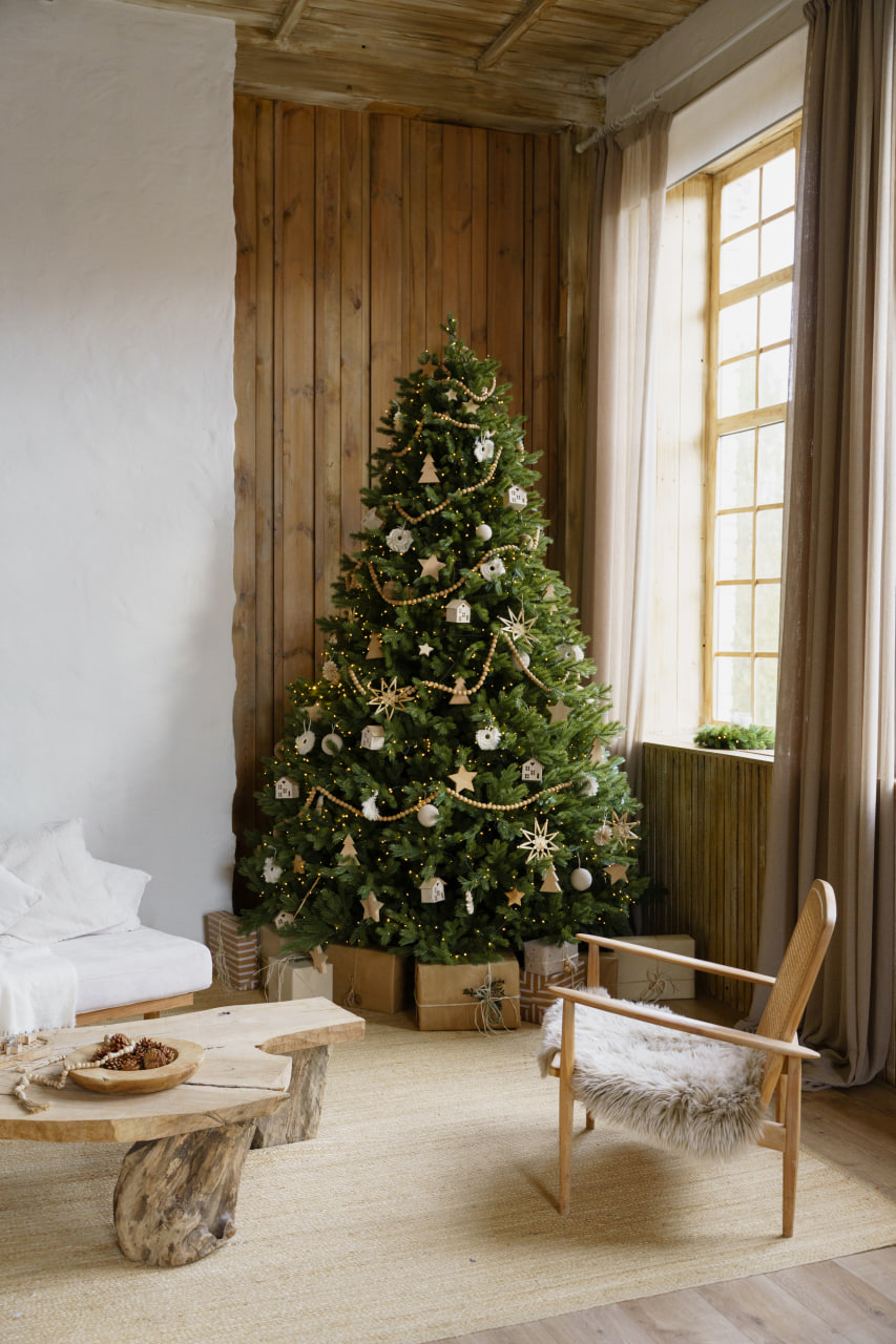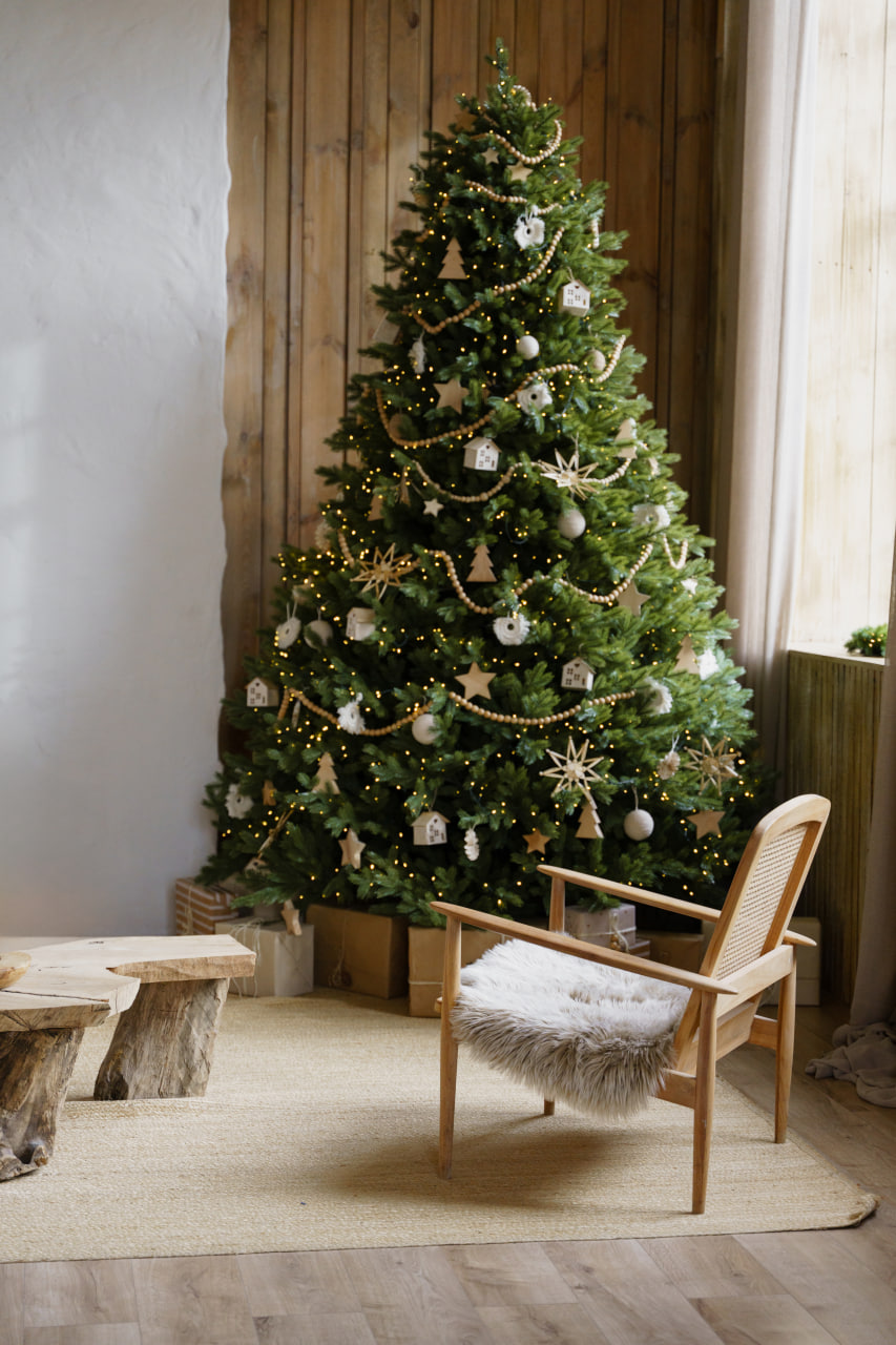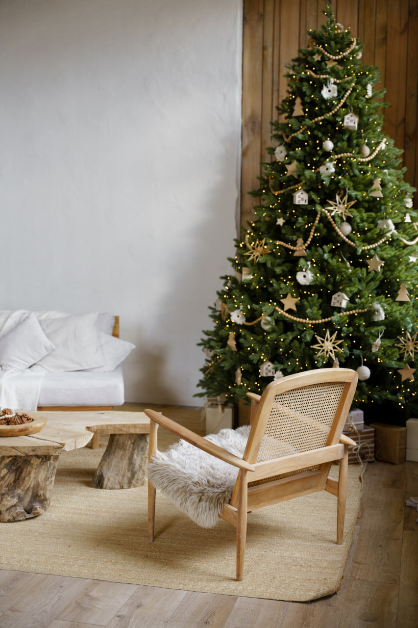 В першій зоні: натуральні матеріали та спокійні кольори, живі фактури дерева й тканини, світлий диван з подушками, крісло, велика ялинка та різдвяний декор.