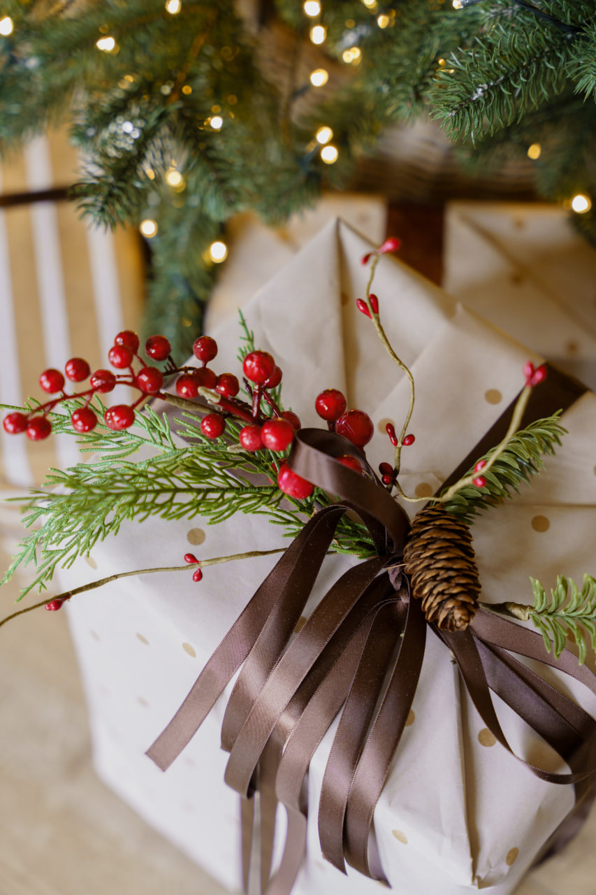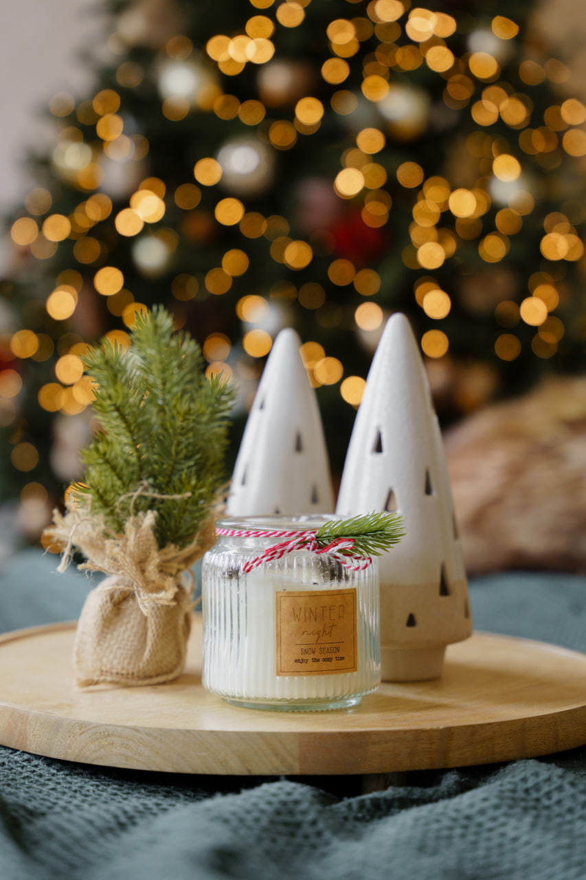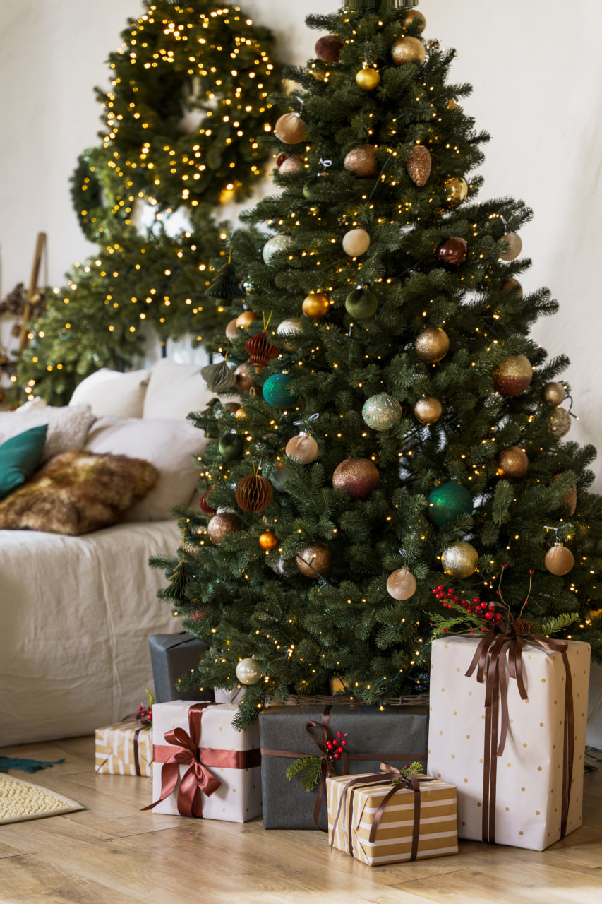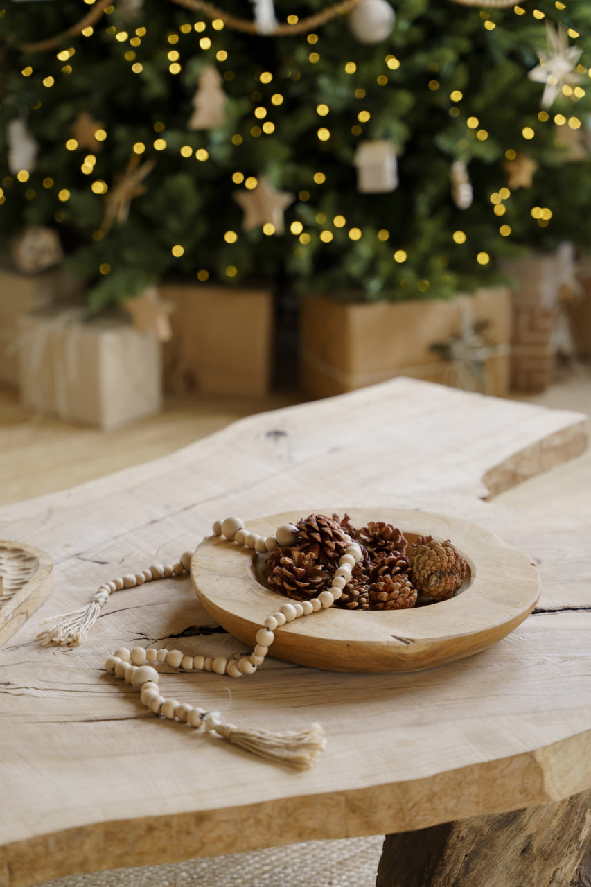 В першій зоні: натуральні матеріали та спокійні кольори, живі фактури дерева й тканини, світлий диван з подушками, крісло, велика ялинка та різдвяний декор.