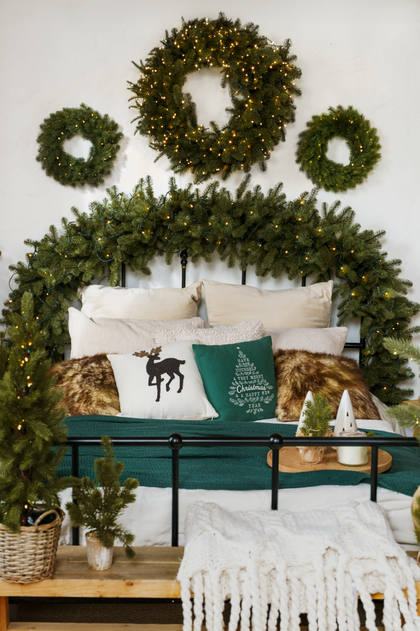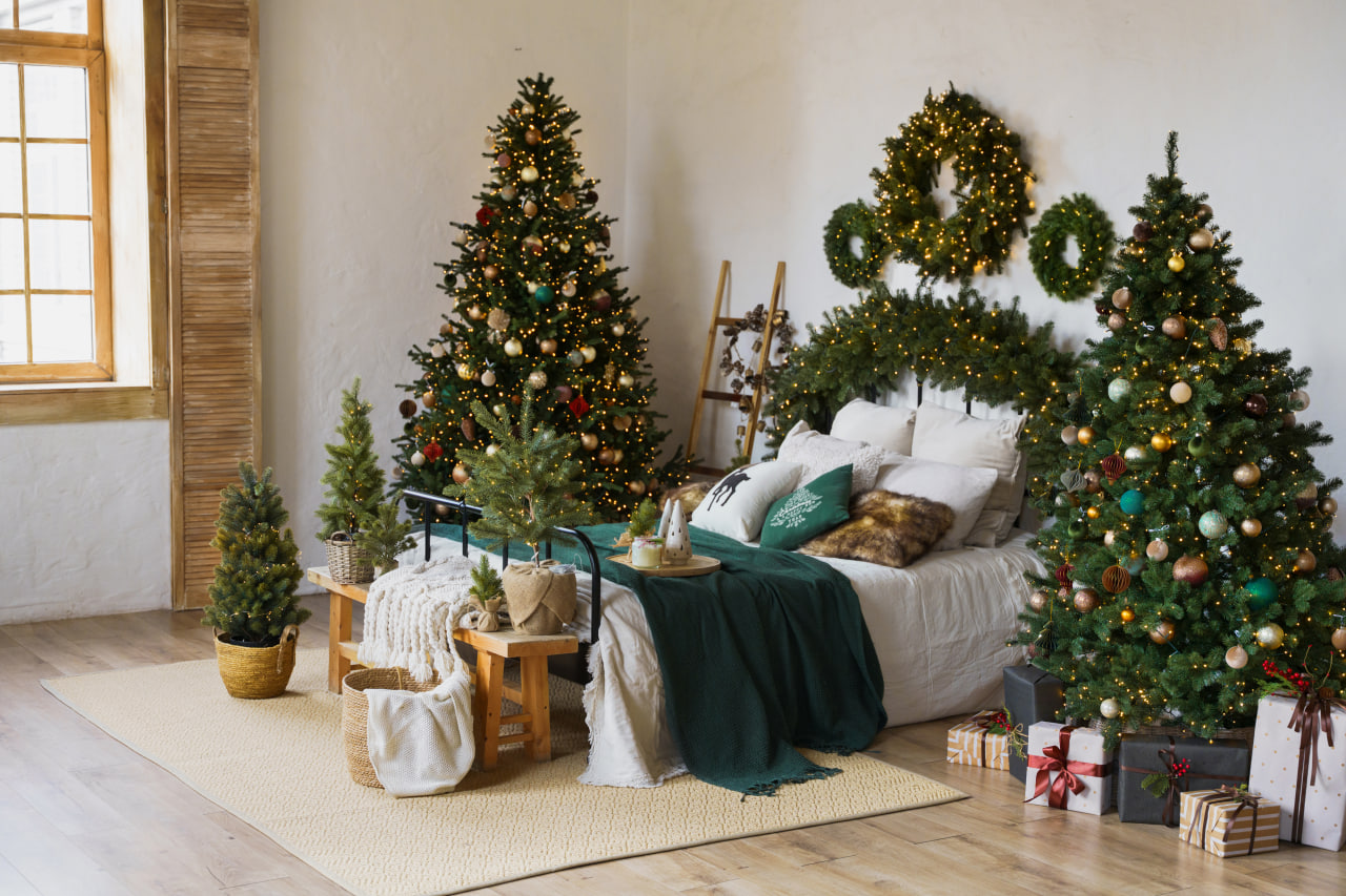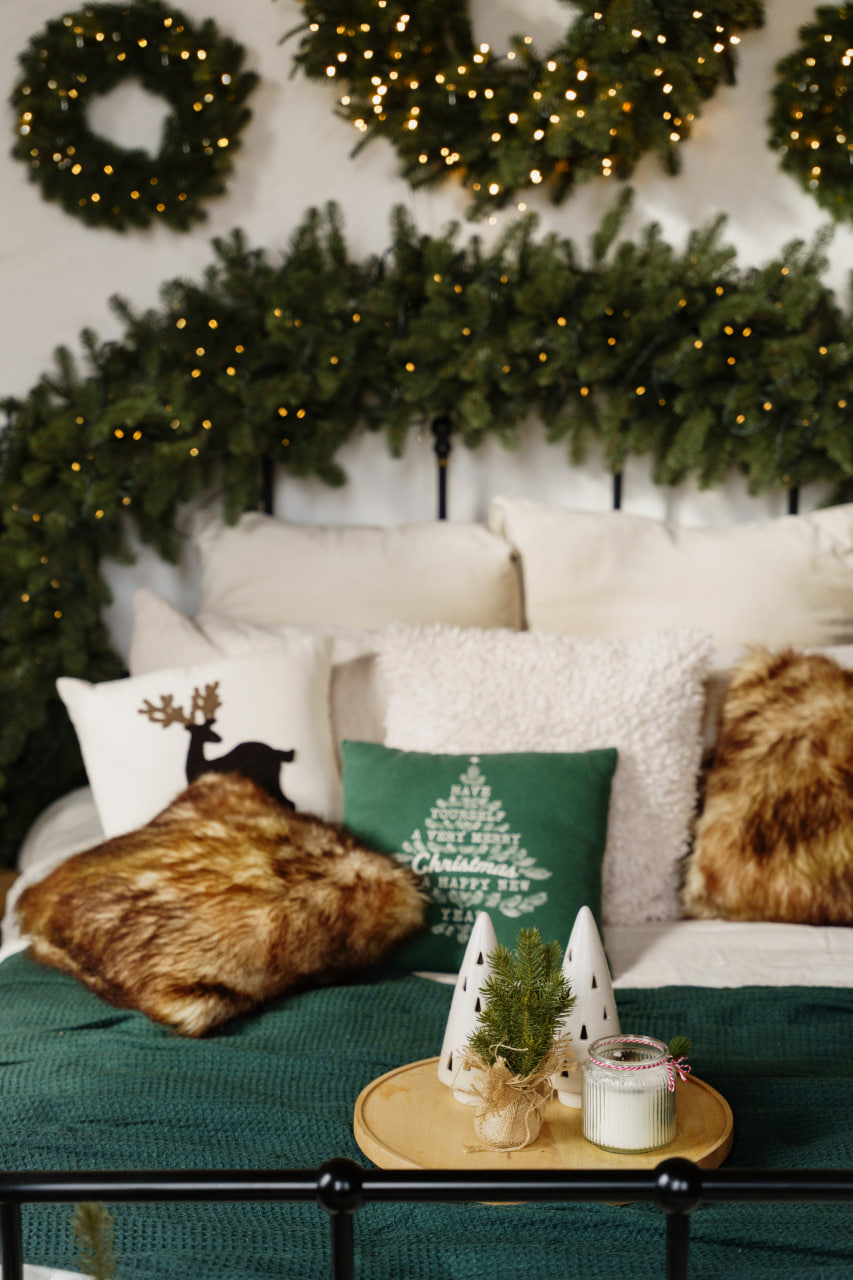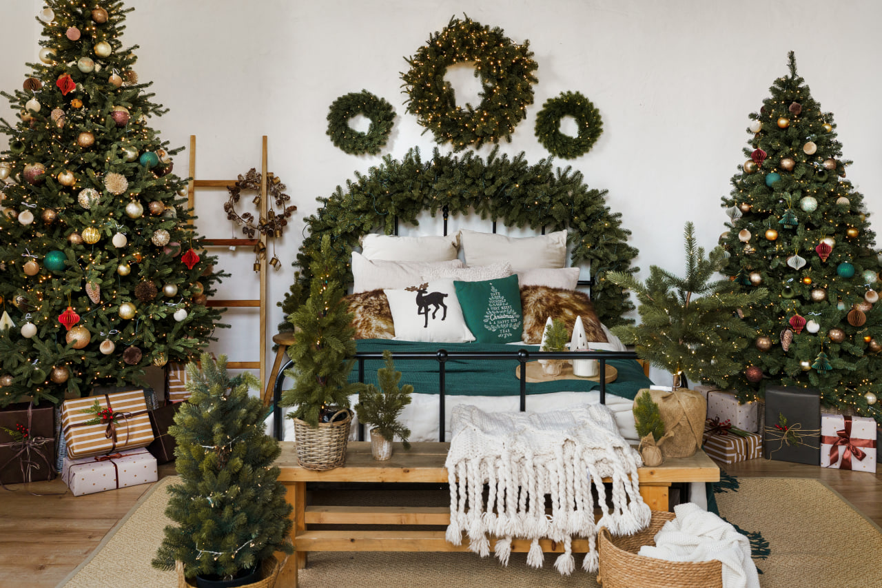 Друга зона з великим металевим ліжком, що вкрите ковдрами і подушками, ялинки з двох боків, безліч вогників, великий хвойний вінок та гірлянди, різноманітне святкове оздоблення.