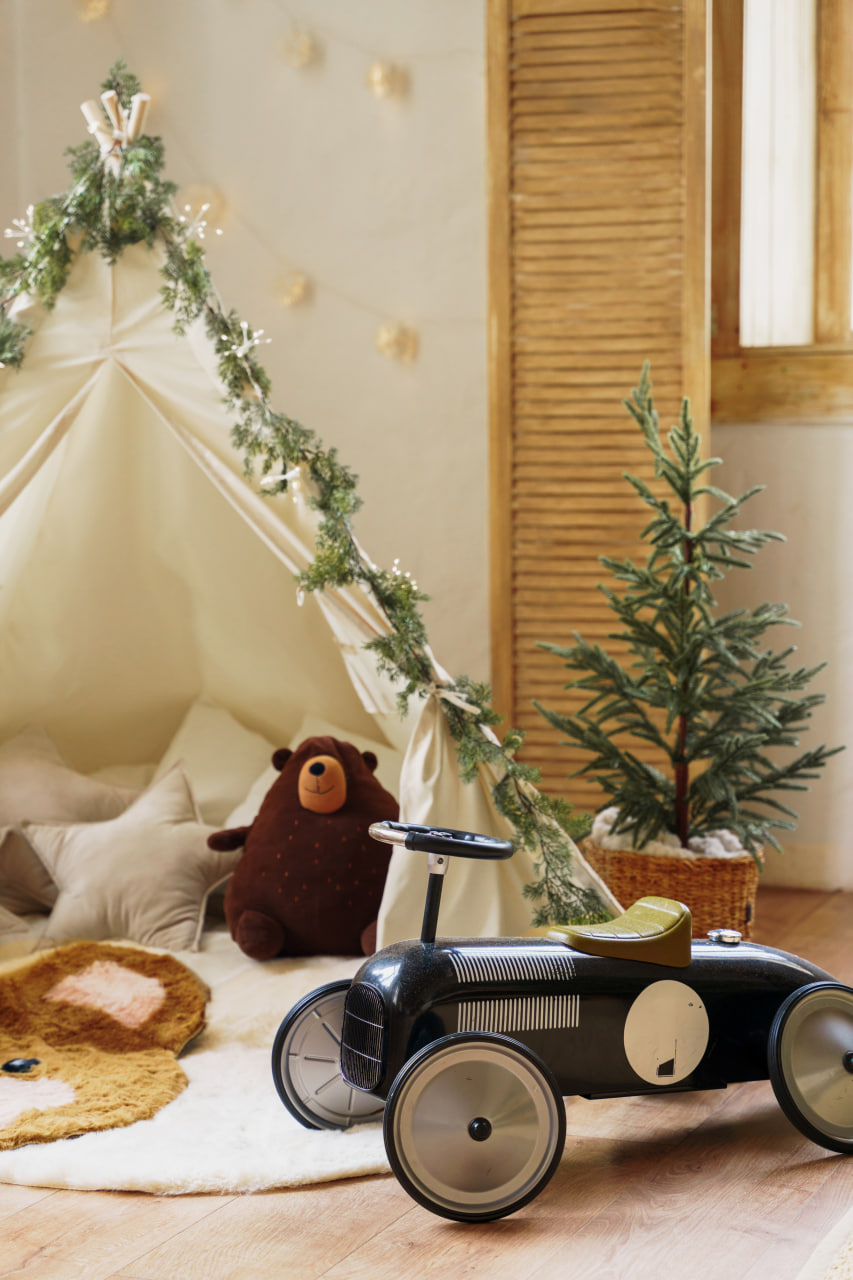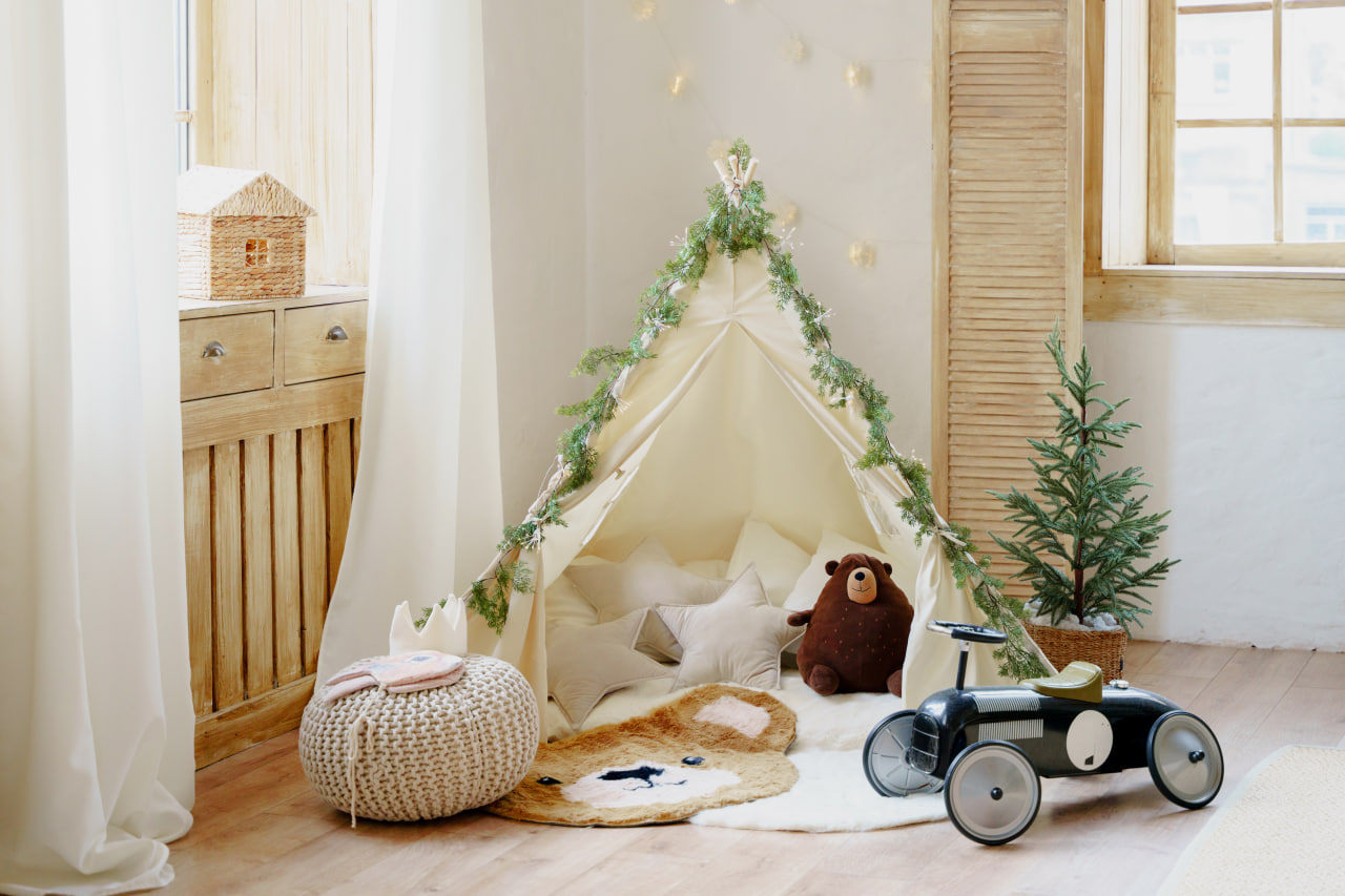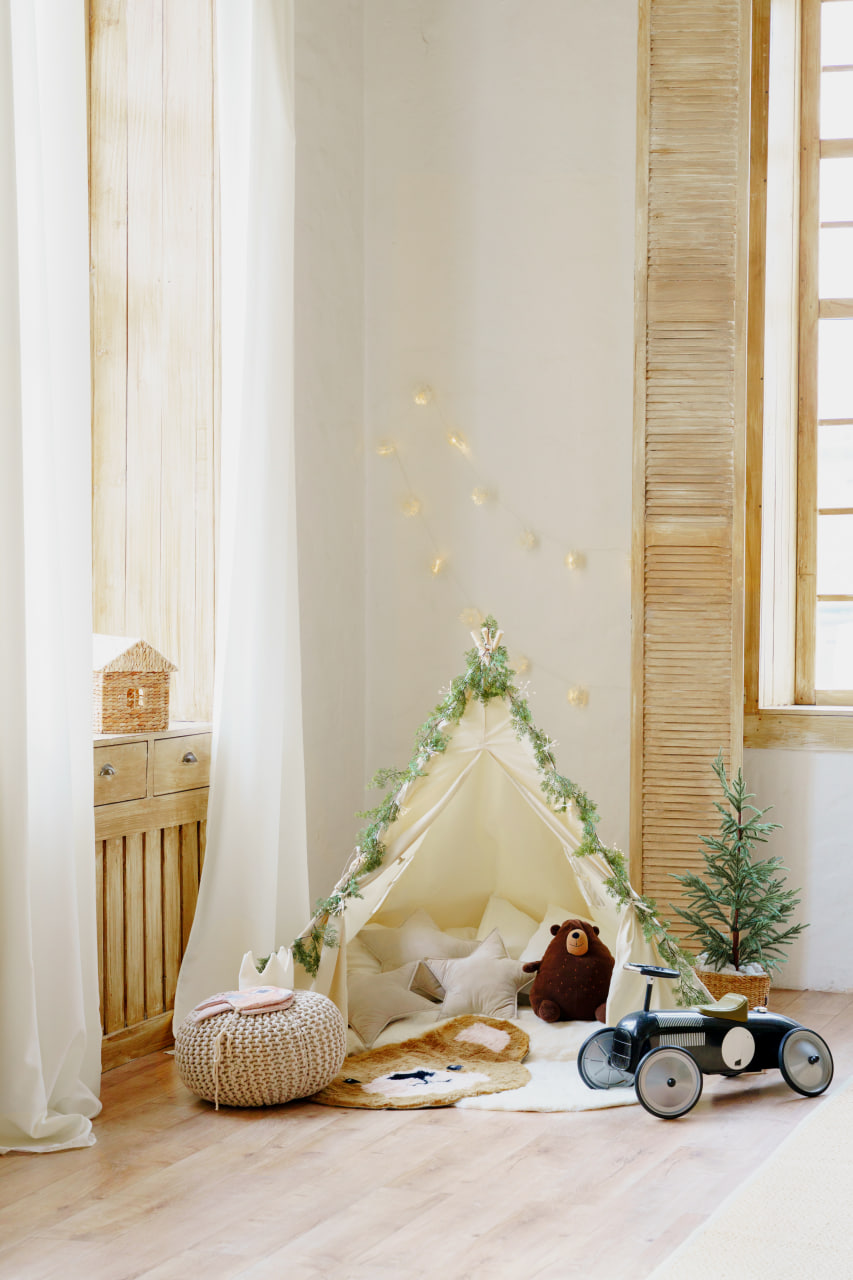 Третя зона – куточок для маленьких мрійників: декоративне шатро оздоблене хвойною гірляндою, море подушок, мерехтіння вогників, натуральні акценти та різноманітні іграшки. Ця зона мобільна, тож елементи можна міксувати між собою.