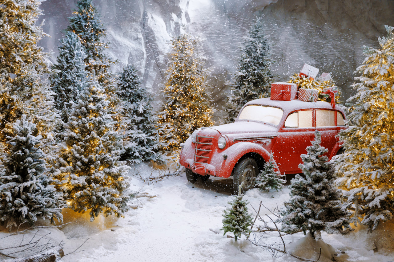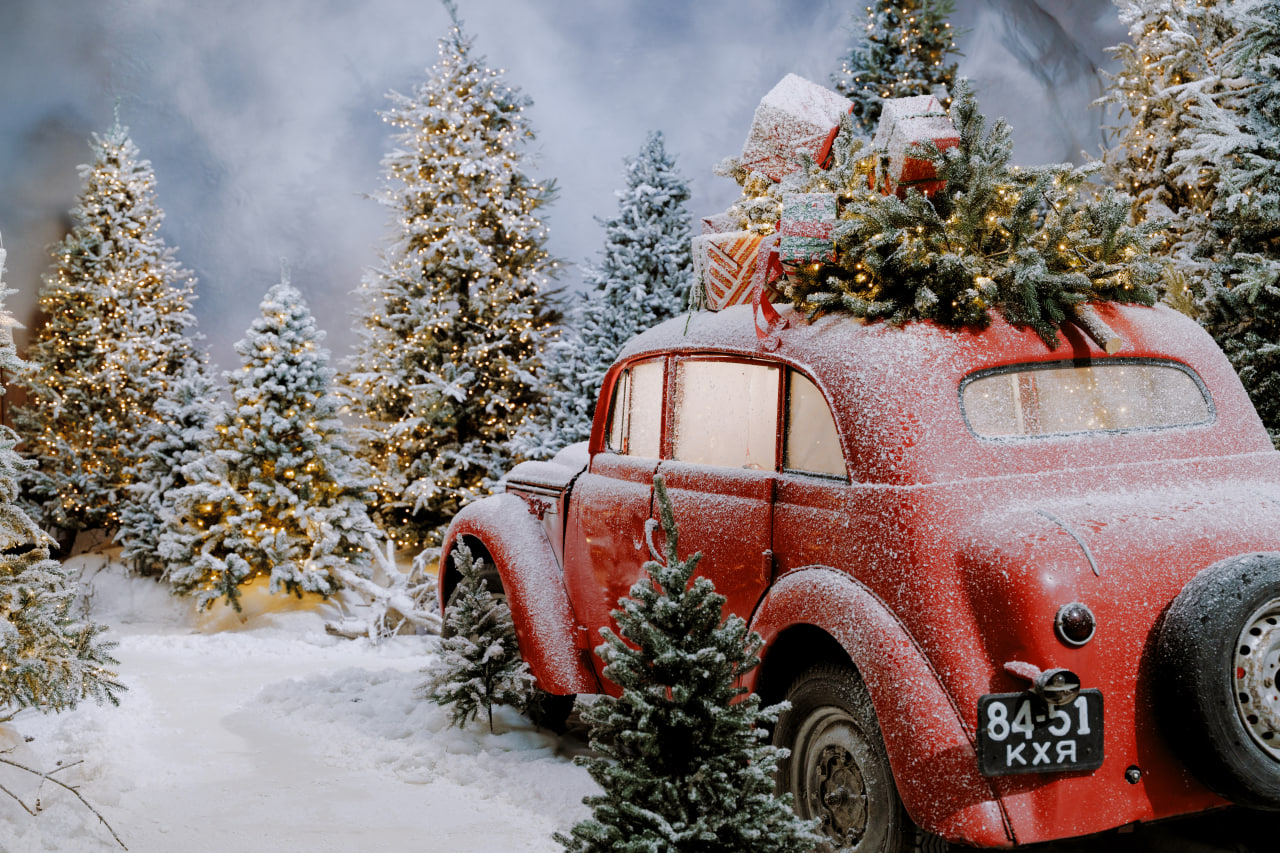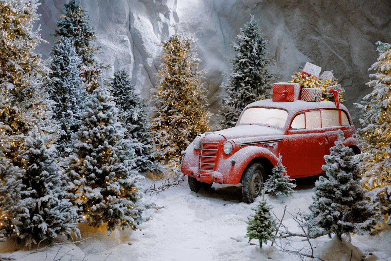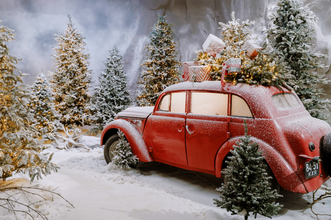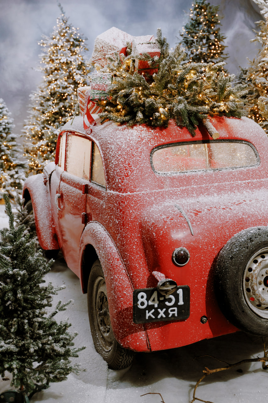 Також тут знаходиться справжній ретро автомобіль з ялинкою на даху.