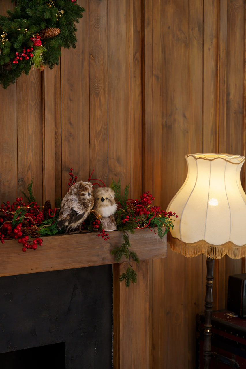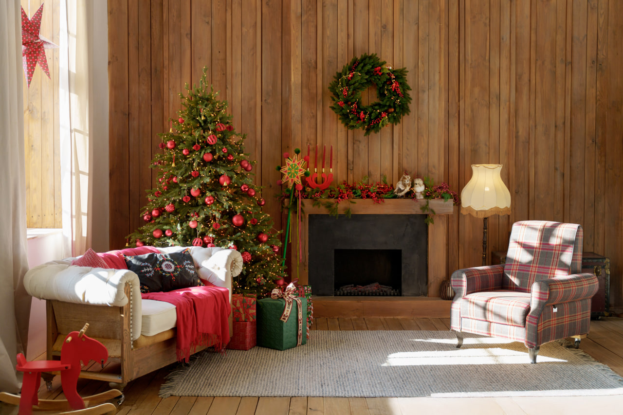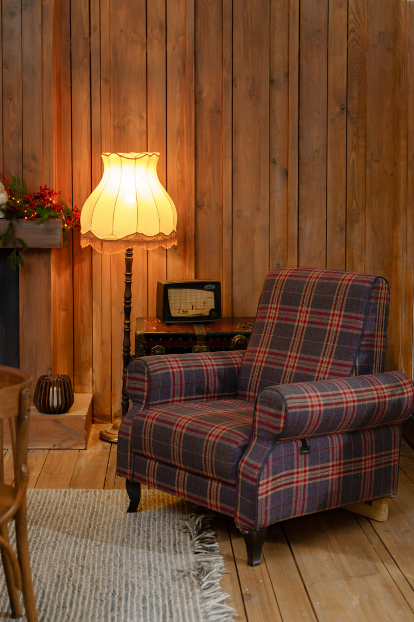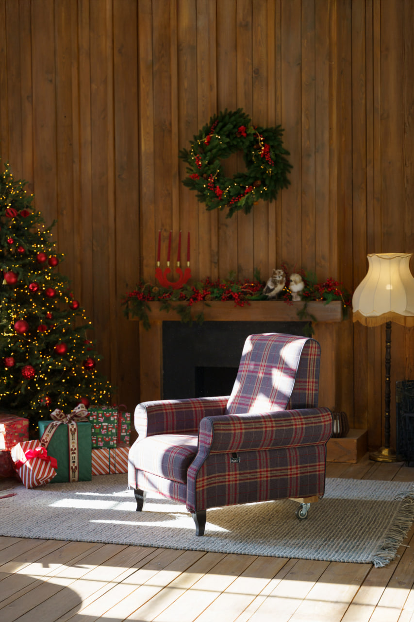 Друга зона: Деревʼяне гірське шале. Затишна локація з каміном, картатим кріслом, рустикальними деревʼяними меблями, текстилем та декором в кольорах Різдва.