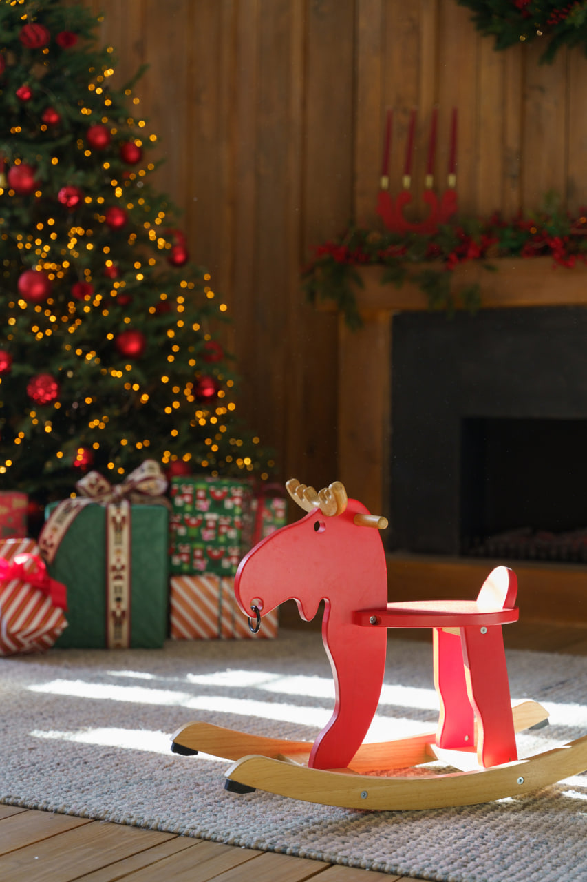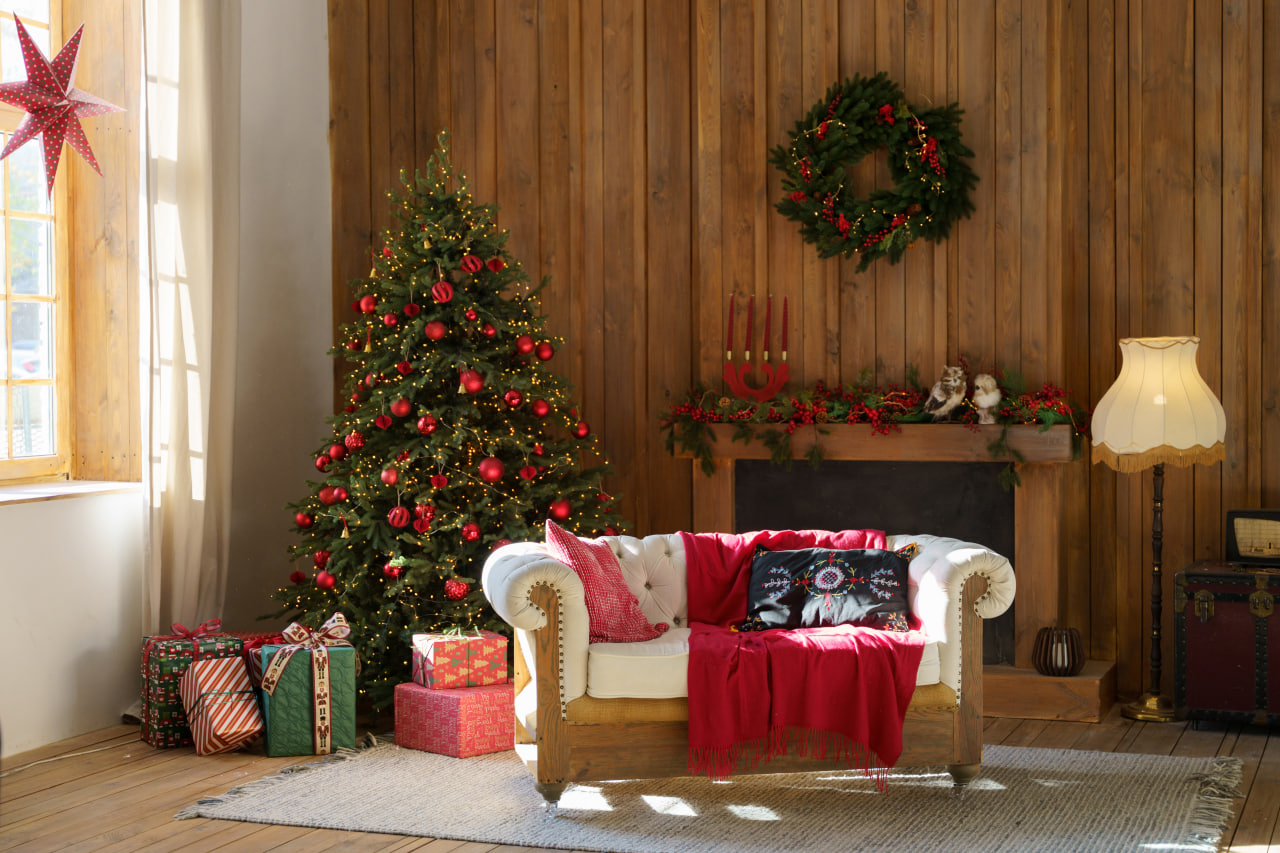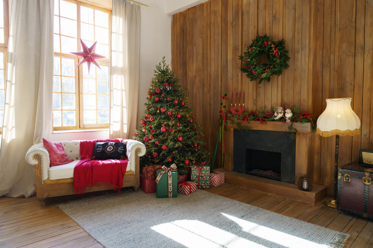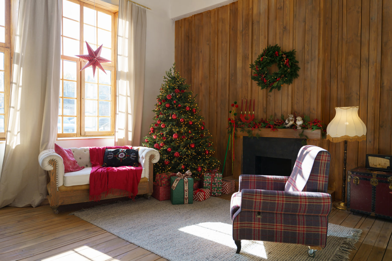 Друга зона: Деревʼяне гірське шале. Затишна локація з каміном, картатим кріслом, рустикальними деревʼяними меблями, текстилем та декором в кольорах Різдва.